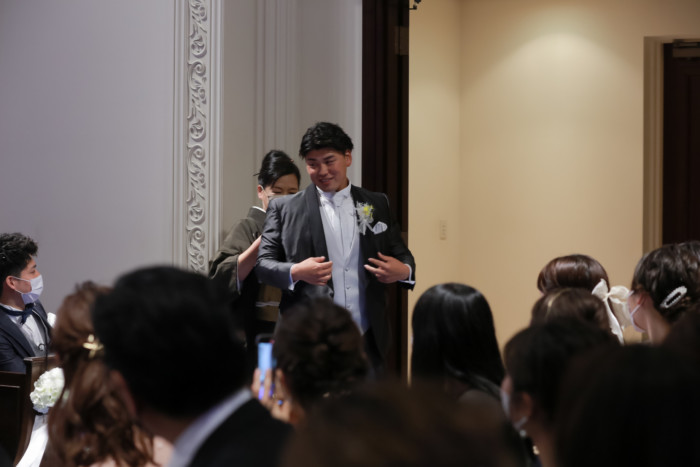 ご新郎入場は、お母様によるジャケットセレモニー 今まで育ててくださったお母様に身支度を整えていただきます