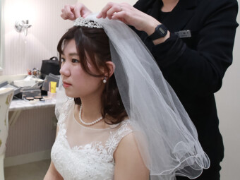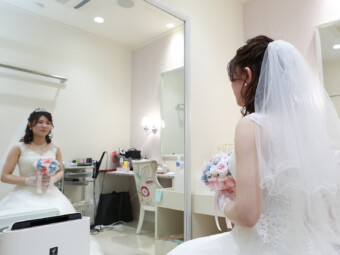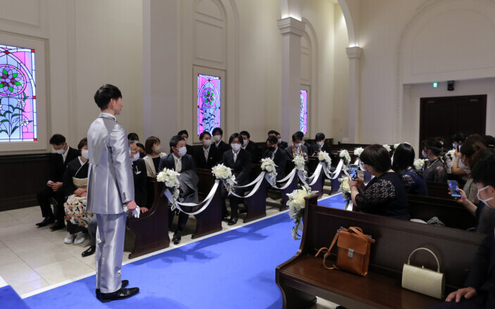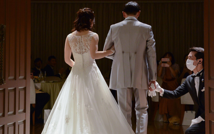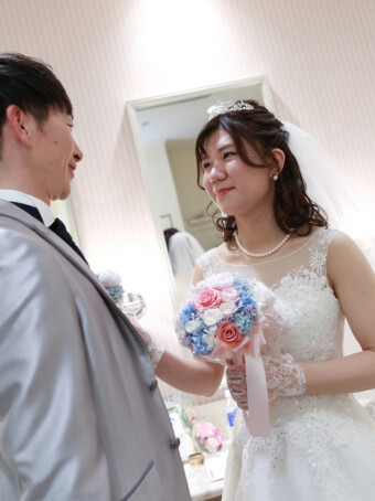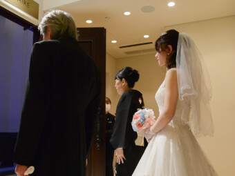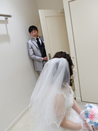 お仕度が整ったおふたりはみんなが待つ会場へ 再入場の準備 映像を見ている会場の中が気になります