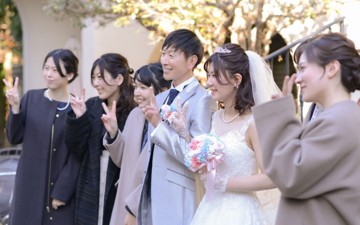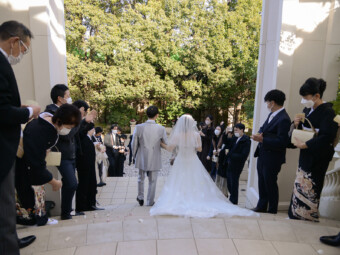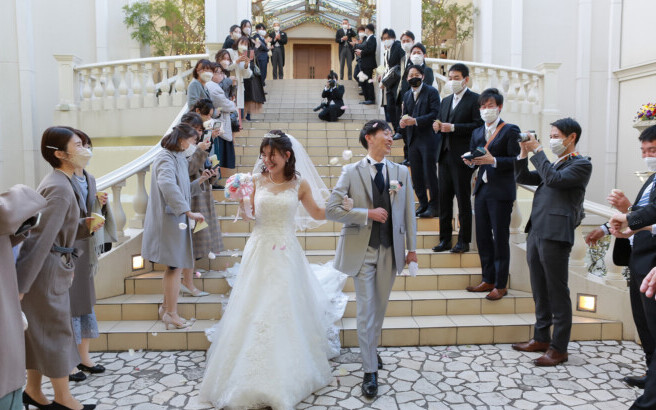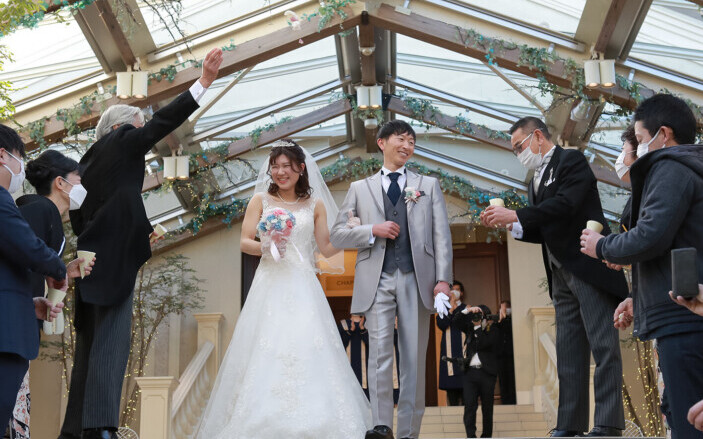 大好きな家族や友人に見届けられ家族になったおふたり 挙式の後は 笑顔いっぱいでのフラワーシャワーへご出発