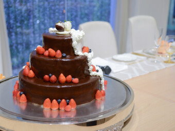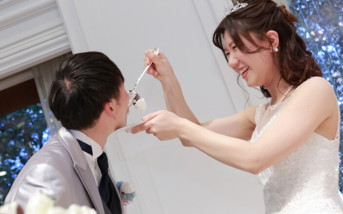 沢山の注目が集まる中、こだわりのケーキに入刀 ファーストバイトでは彼には大きなスプーンで食べてもらいました