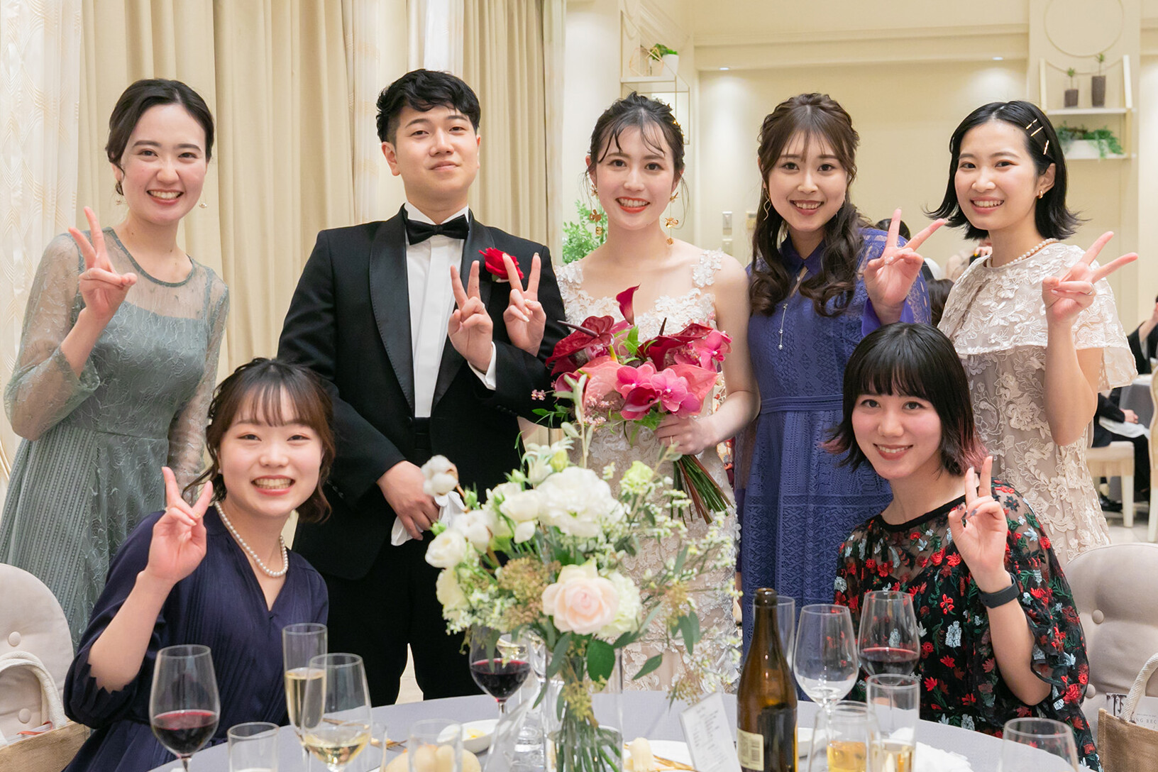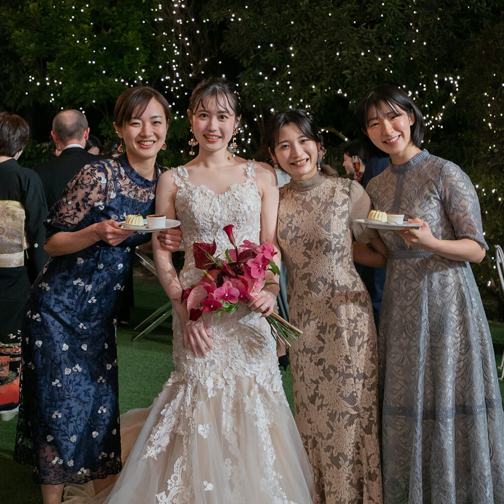 アイテムや進行にこだわったご結婚式 ファーストミートやビックスプーン演出を取り入れました ドリンクやケーキもオリジナルで考えられたご新婦こだわりのお酒は男性ゲストにも喜ばれました ご新婦こだわりのアイテムは マゼンダ×ゴールドのアイテム 透き通るご新婦の肌と白亜の邸宅にぴったりで 夜のパーティでもしっかり主役になれるコーディネートです