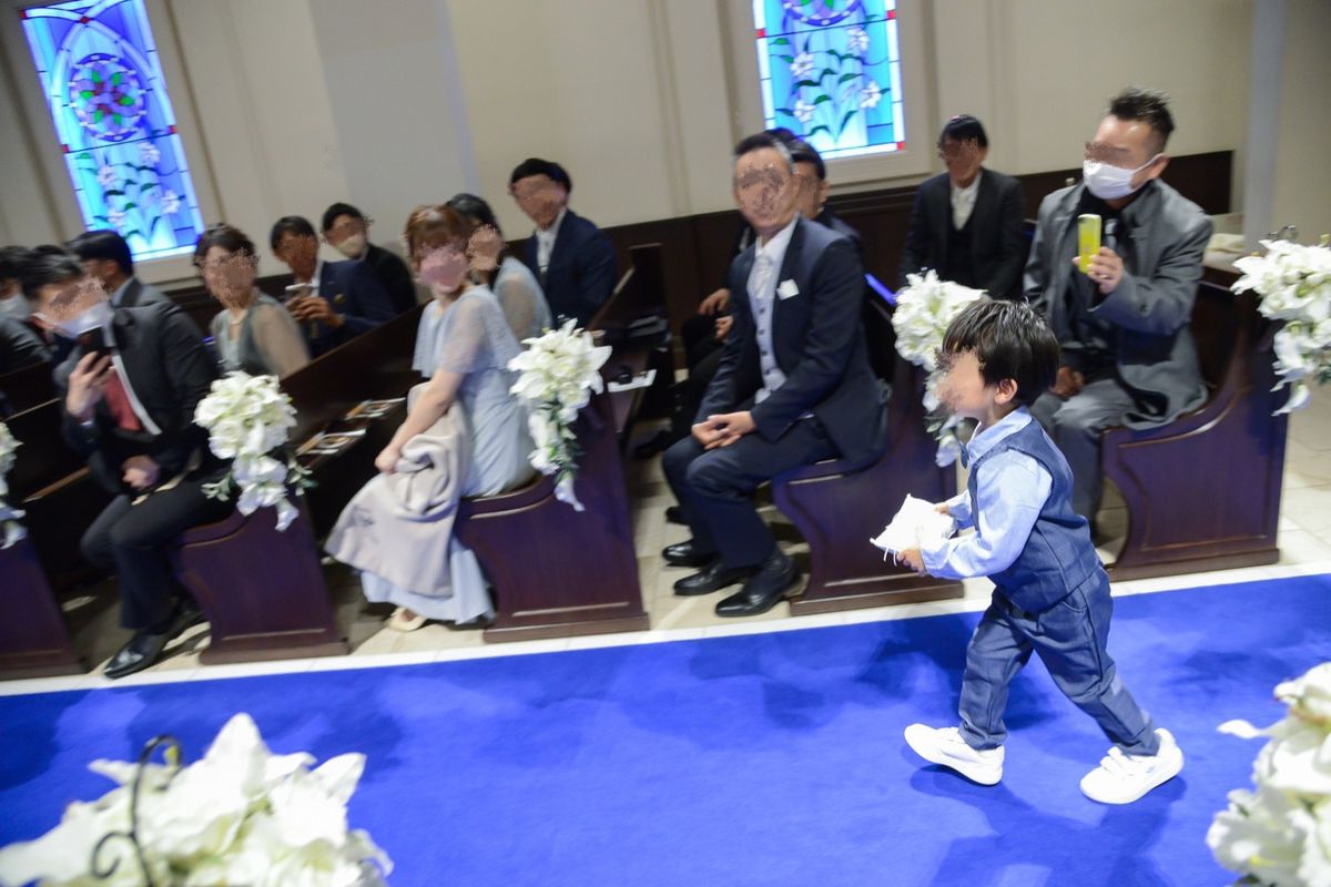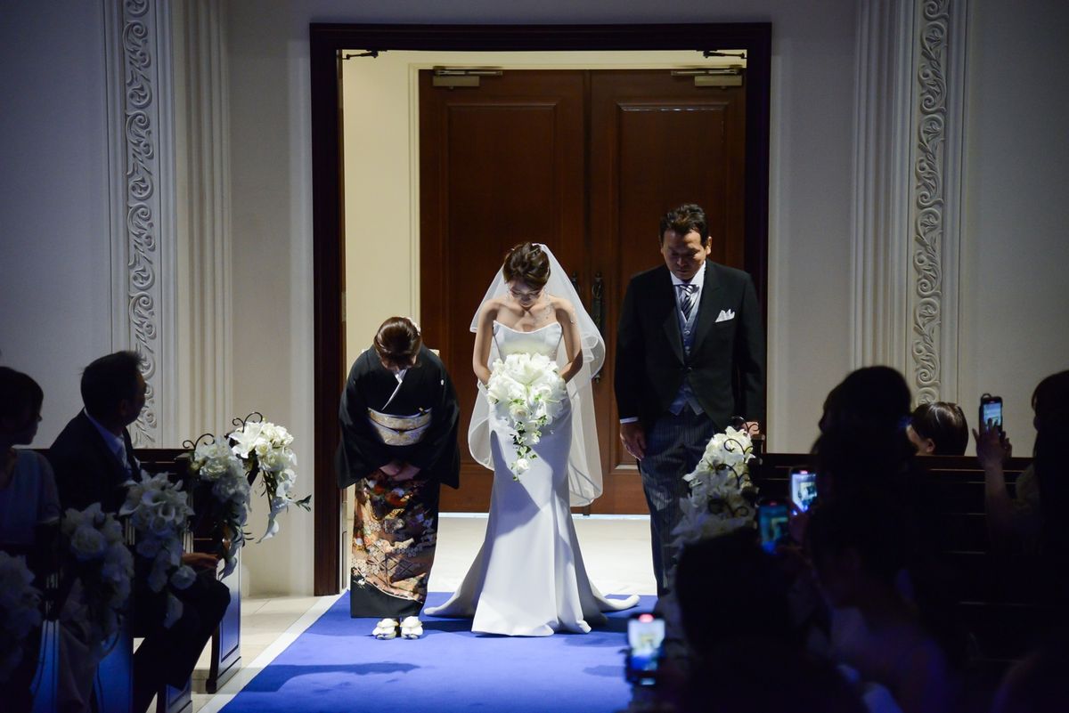 式場決定の理由にもなった、ご新婦が高校生の頃から憧れていたという青いバージンロードが特徴のチャペルです。当日は雨天ながらも、光を調整できるステンドグラスにより、明るく綺麗な空間での挙式が叶いました。バージンロードに映えるようにとこだわった長めのトレーンも美しく、オフショルダーでマーメイドラインのドレスを着こなすために、身体作りまで努力されたご新婦の想いが実った瞬間です。