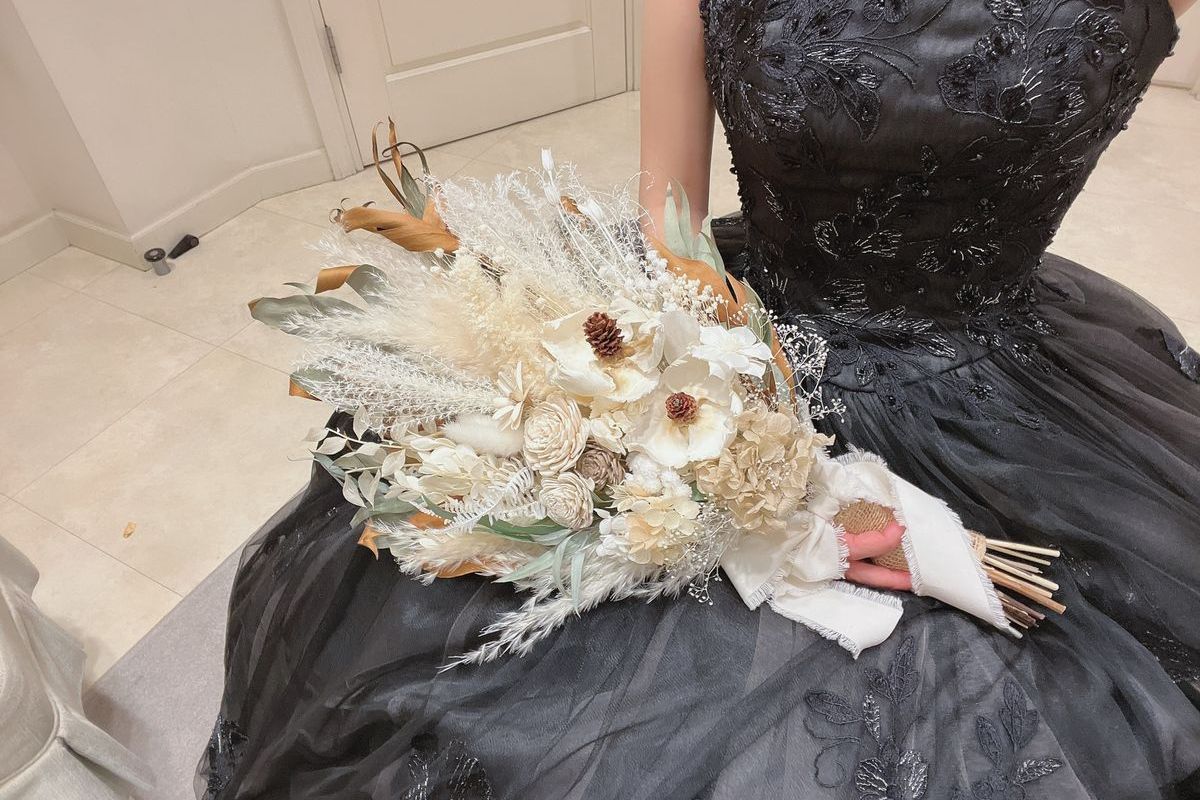 披露宴では、会場の大階段を活かし、照明を落とした中での入場演出を取り入れました。ご新婦は、プリンセスラインで可愛さとかっこよさを両立し、「あなた以外の色に染まりません」という意味を持つブラックのドレスにお色直しをされて再入場。ゲストが持つサイリウムが綺麗に光り、ライブ会場のような景色が広がりました。装花はカラードレス用のブーケに合わせ、白・ベージュ・茶色のドライフラワーを使ったコーディネートです。