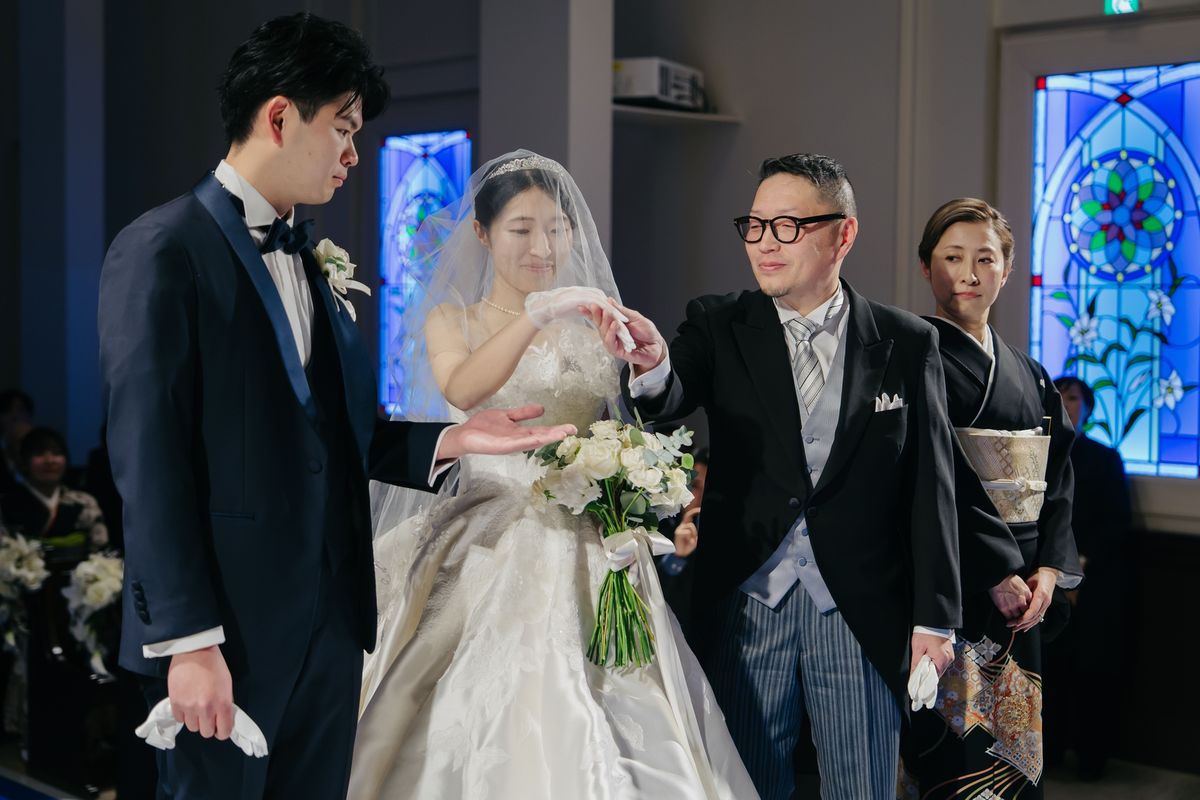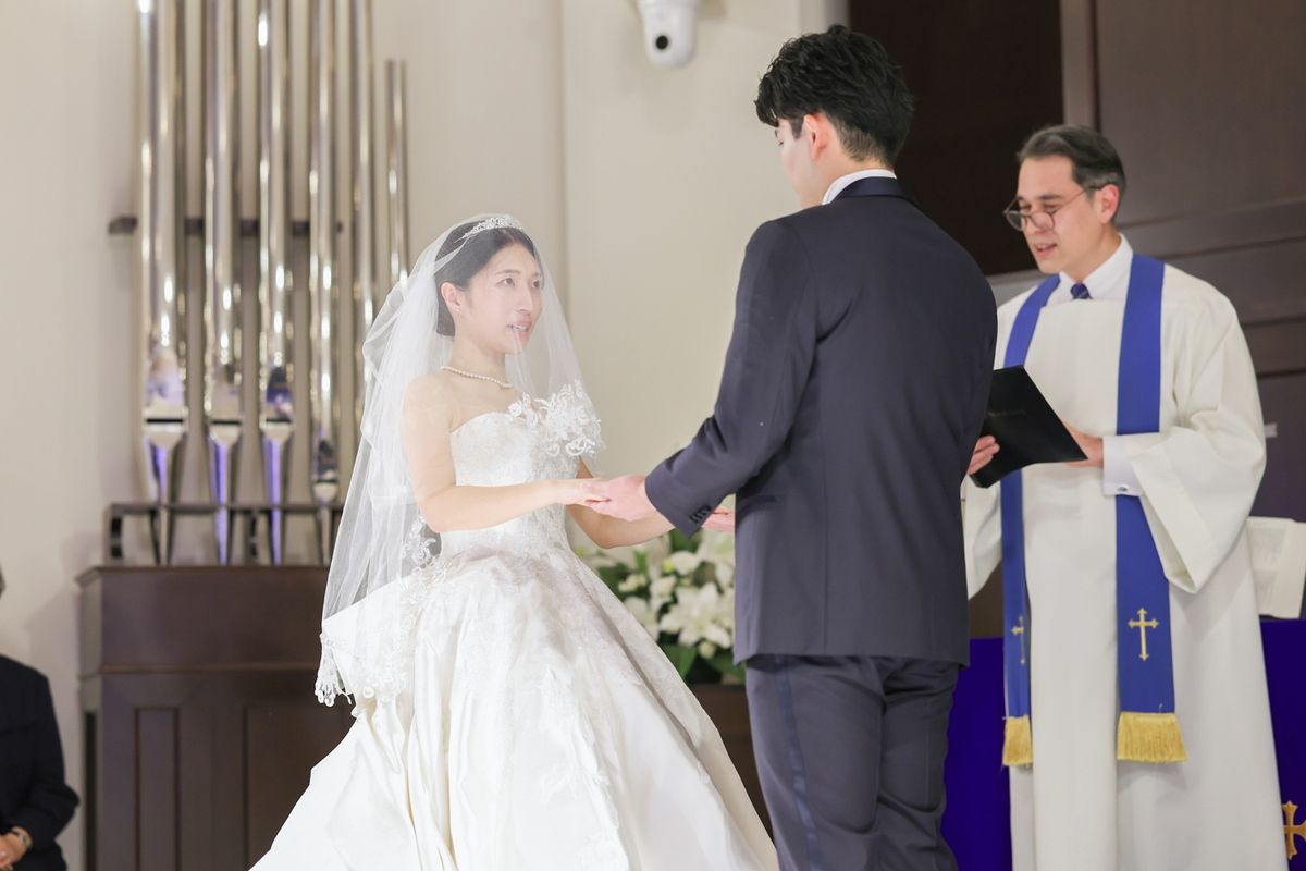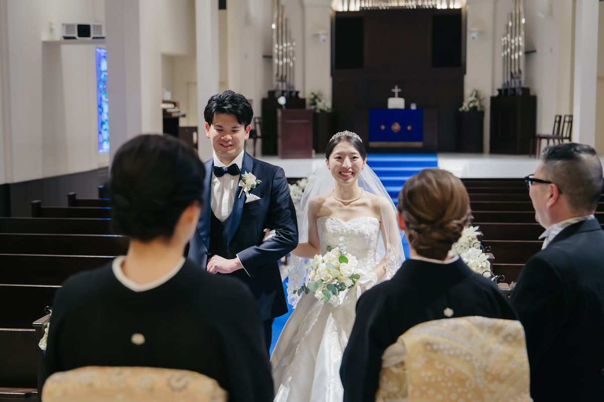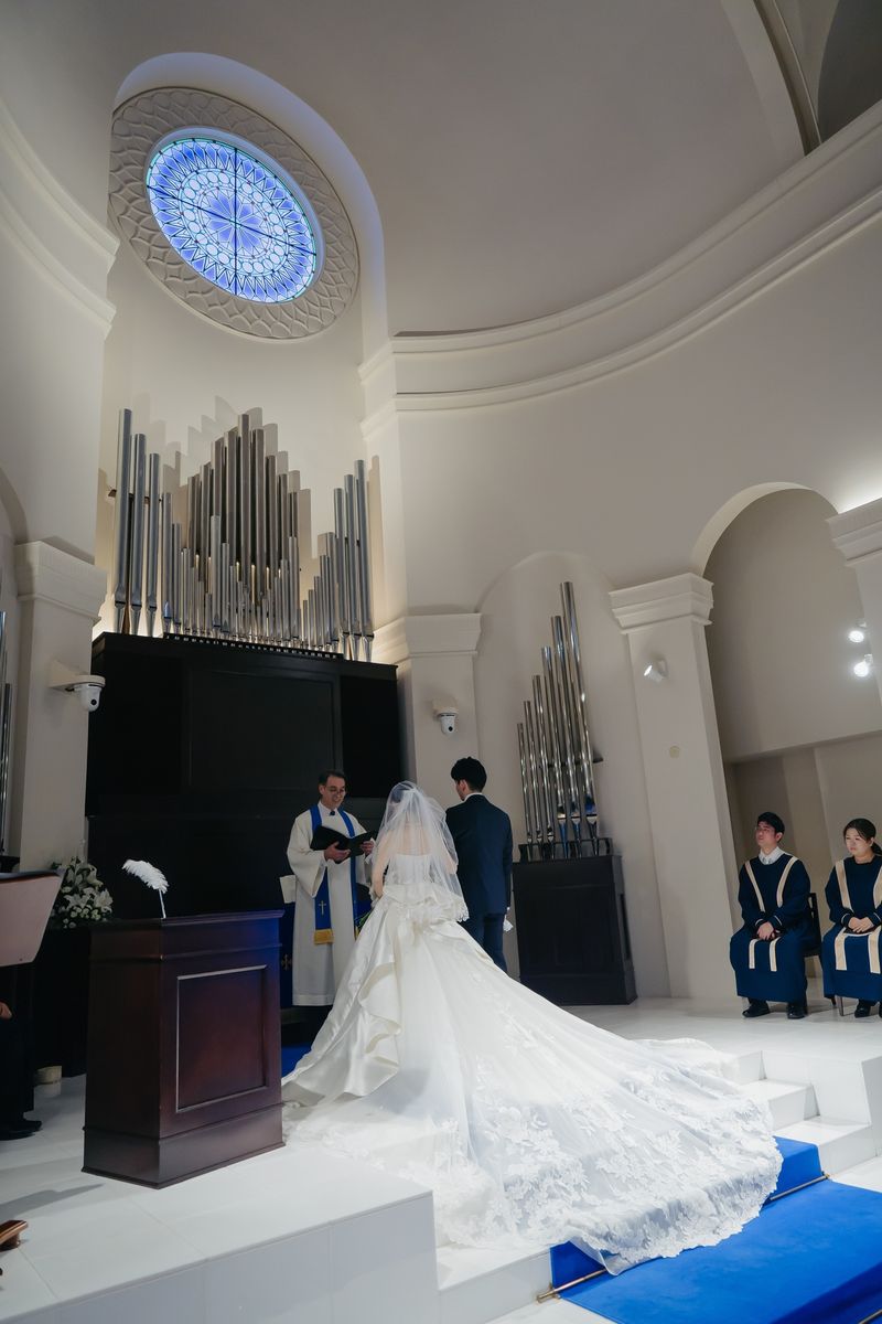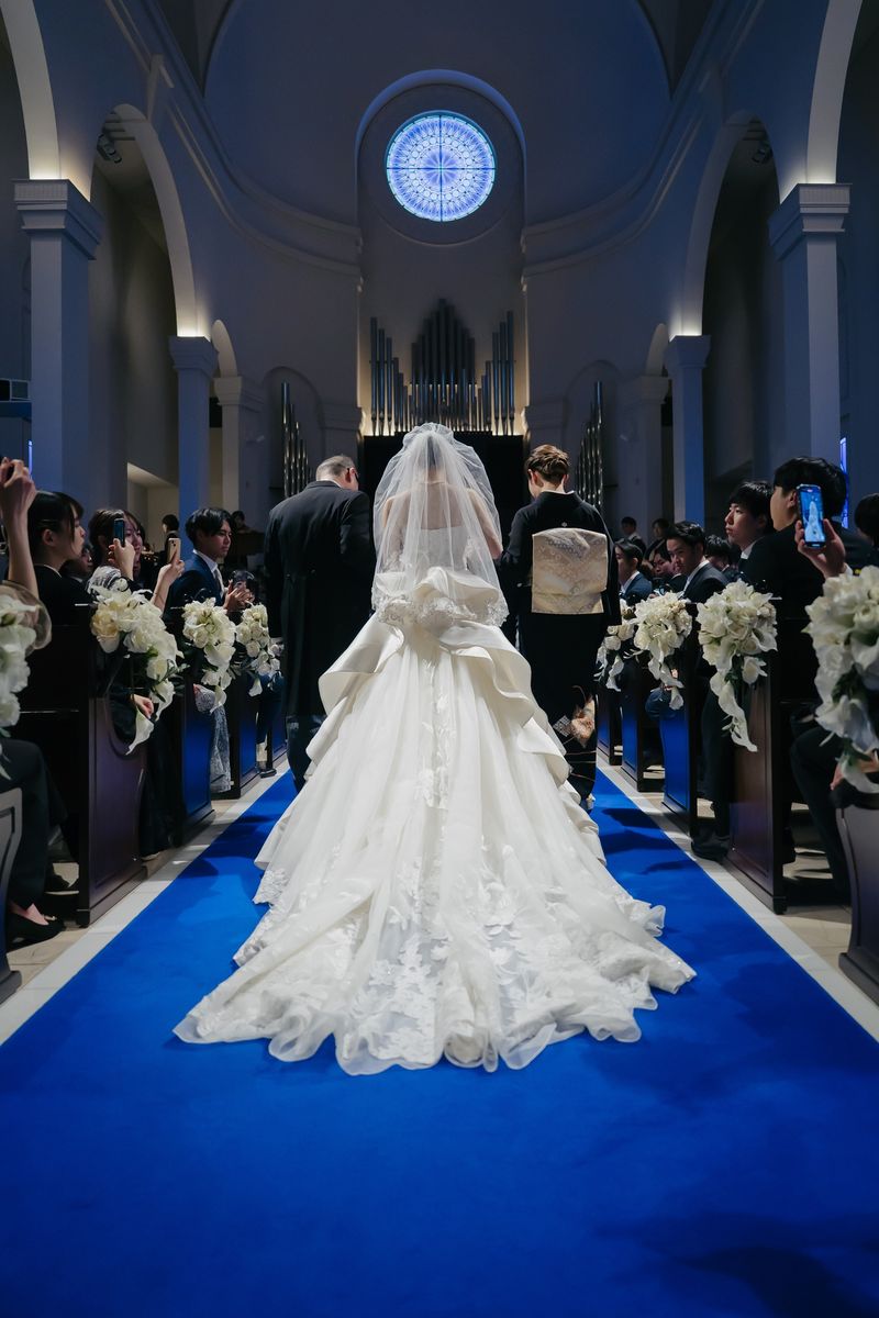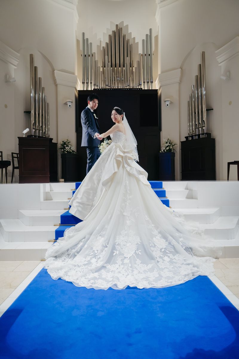 ご新婦は「木目調の温かな雰囲気より、白を基調としたスタイリッシュな雰囲気が好み」とのことで、当チャペルの白い内装とステンドグラス越しに寒色系の光が入るところに惹かれ、当式場を選ばれています。 当日は、青いバージンロードにロングトレーンのウェディングドレスがひと際映えていました。聖壇には高さがあるので、参列者席の足元近くまでドレスが広がり、ゲストの皆様にもしっかりとご覧いただけたと思います。