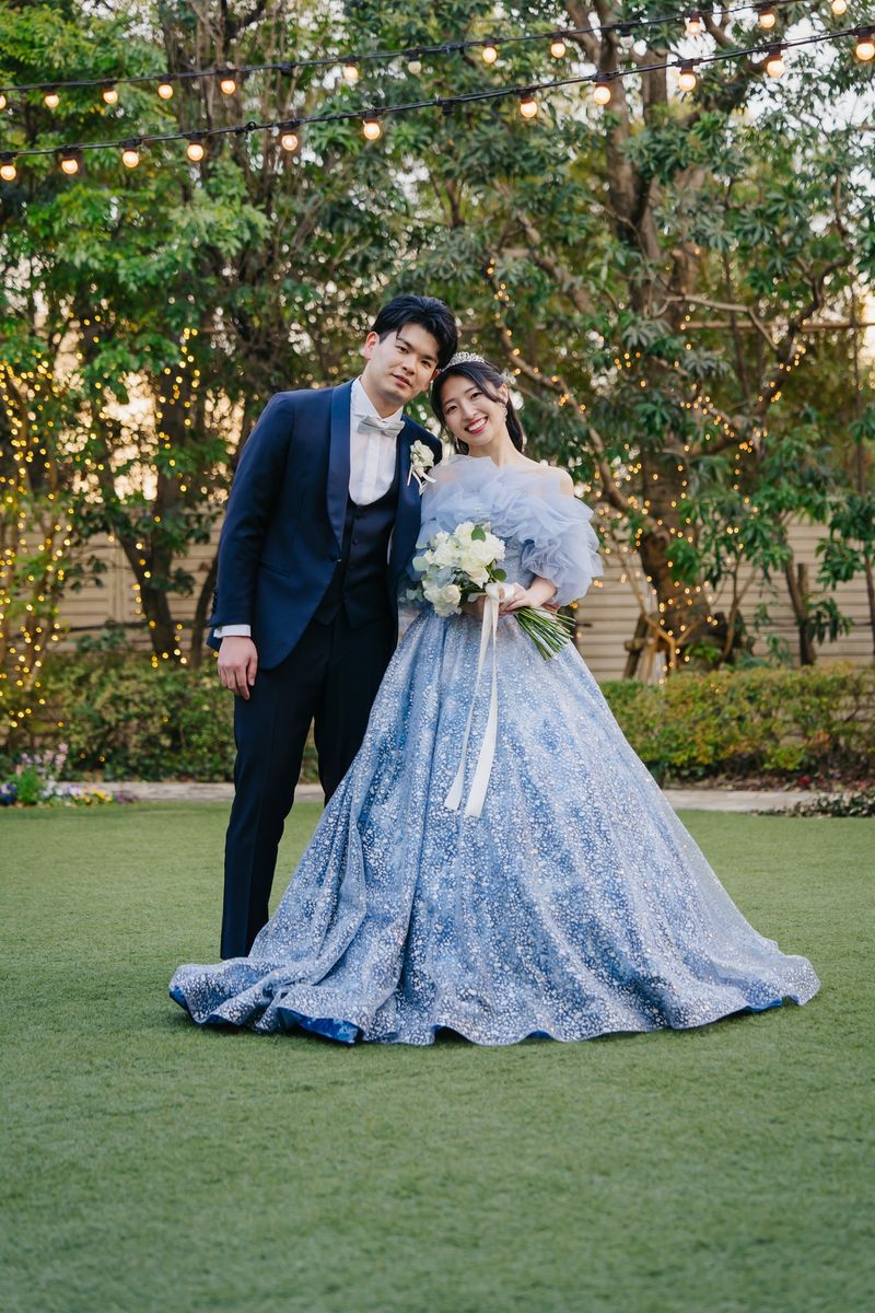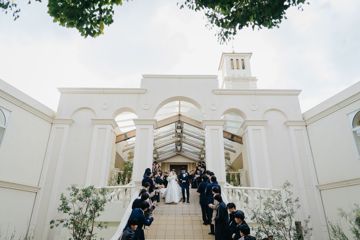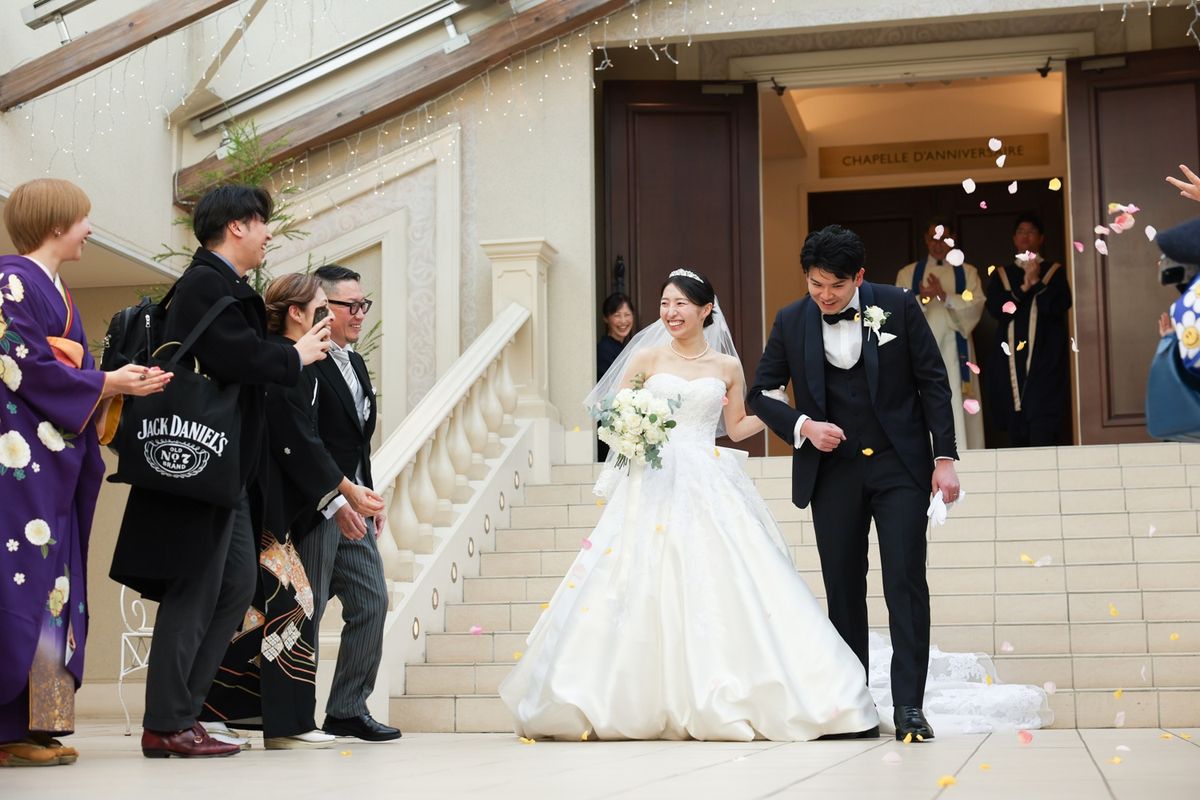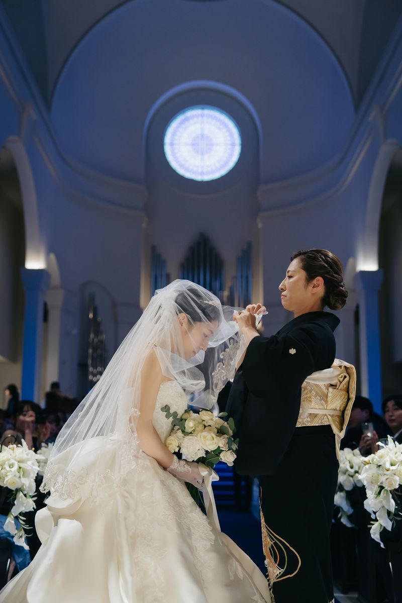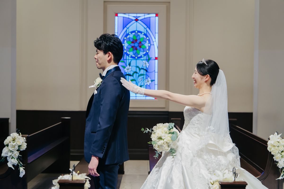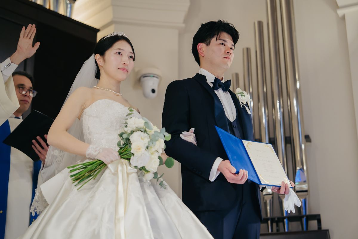 ご新婦は「木目調の温かな雰囲気より、白を基調としたスタイリッシュな雰囲気が好み」とのことで、当チャペルの白い内装とステンドグラス越しに寒色系の光が入るところに惹かれ、当式場を選ばれています。 当日は、青いバージンロードにロングトレーンのウェディングドレスがひと際映えていました。聖壇には高さがあるので、参列者席の足元近くまでドレスが広がり、ゲストの皆様にもしっかりとご覧いただけたと思います。