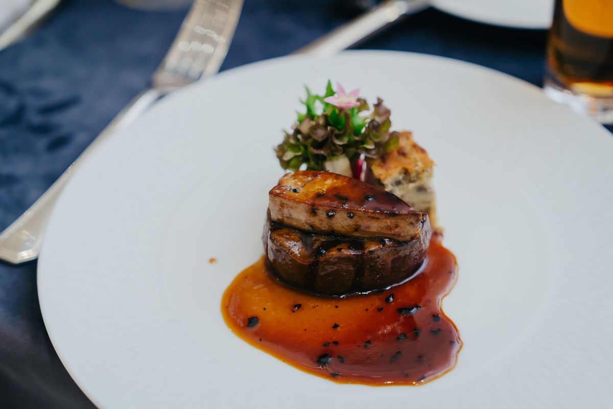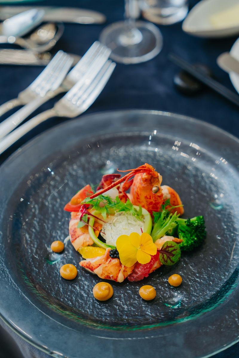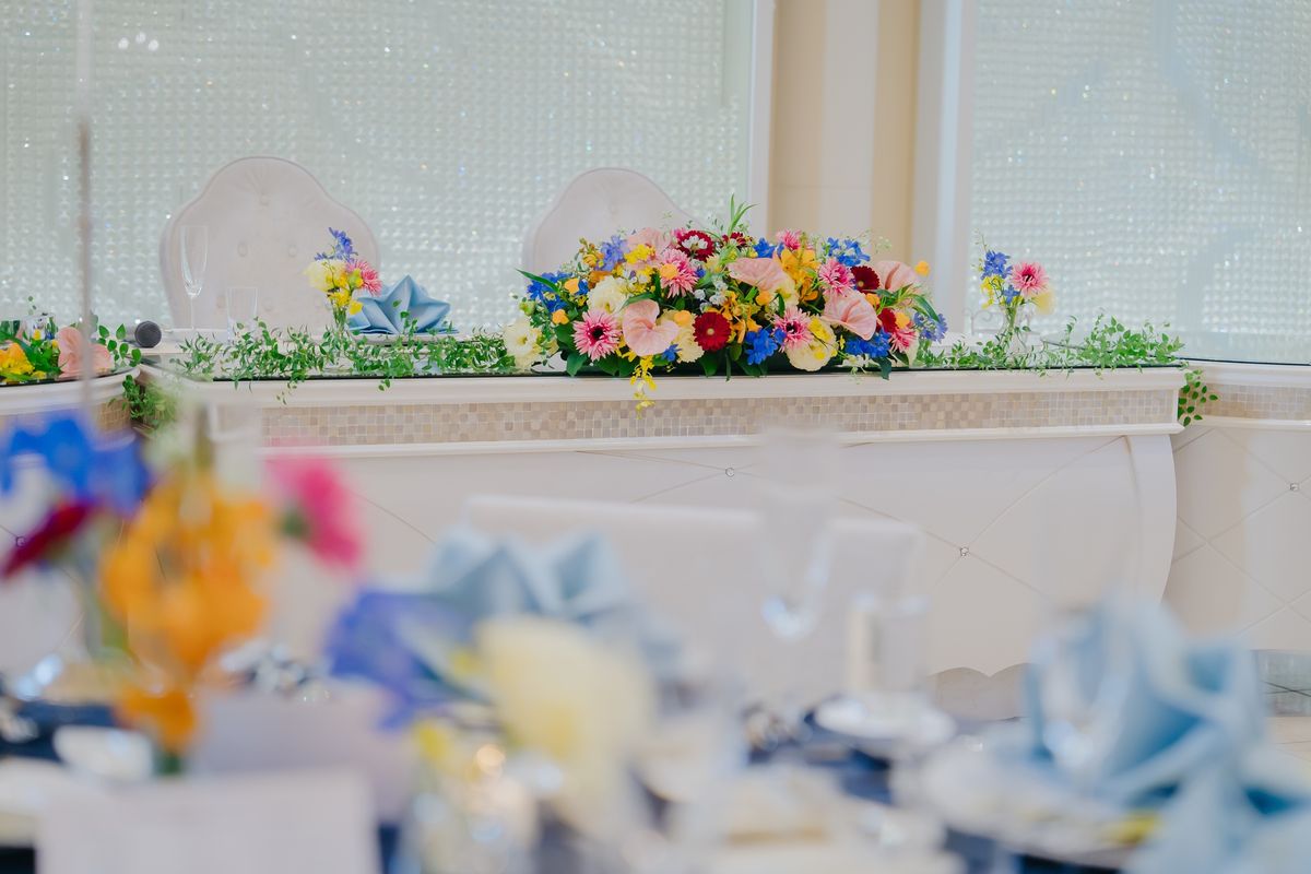 開放的でアットホームな会場『シェル ダ ジュール』は、ガーデンもありウェルカムパーティやデザートビュッフェなどの演出が叶います。会場装花はピンクや青をベースにカラフルなイメージで。ボリュームを出しすぎないカジュアルなアレンジが、グレーのテーブルクロスとの相性も抜群です。お料理は実際に試食をし、ご新郎が好きな海老の前菜のコースを選択。オマール海老の頭がインパクト大で、ゲストを楽しませていました。