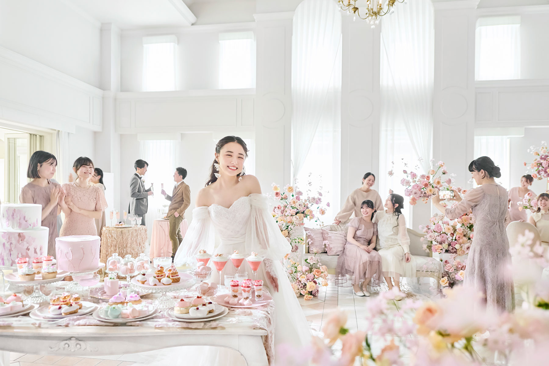 全面ガラス張りの窓から差し込む光、白を基調としたナチュラルな空間「ヴィラ アジュール」。会場内には、海と太陽と光のモチーフが散りばめられており、上品かつ、可憐な世界が広がる空間。会場とつながるガーデンテラスには、見ているだけで幸せな気分になれるカラフルなスイーツ。ゲストの皆様へ、おふたりらしいオリジナリティ溢れるおもてなしをお届けいただけます。