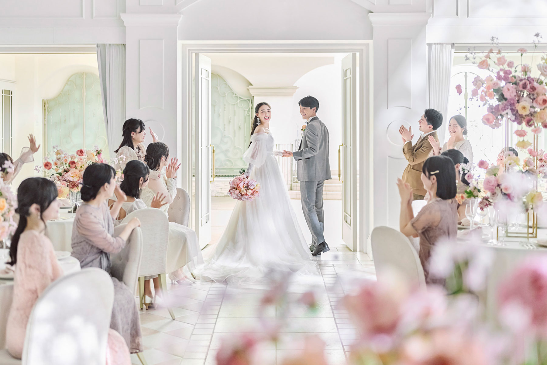 白基調の会場だからこそ自由に選べるコーディネート次第で、おふたり好みに変更可能 ドレスの色味やシーズンに合わせてアレンジ