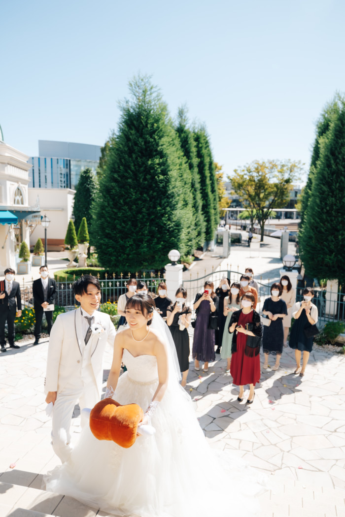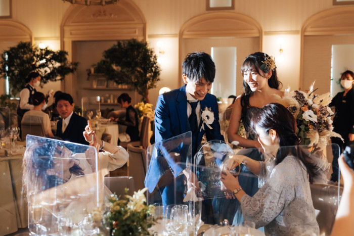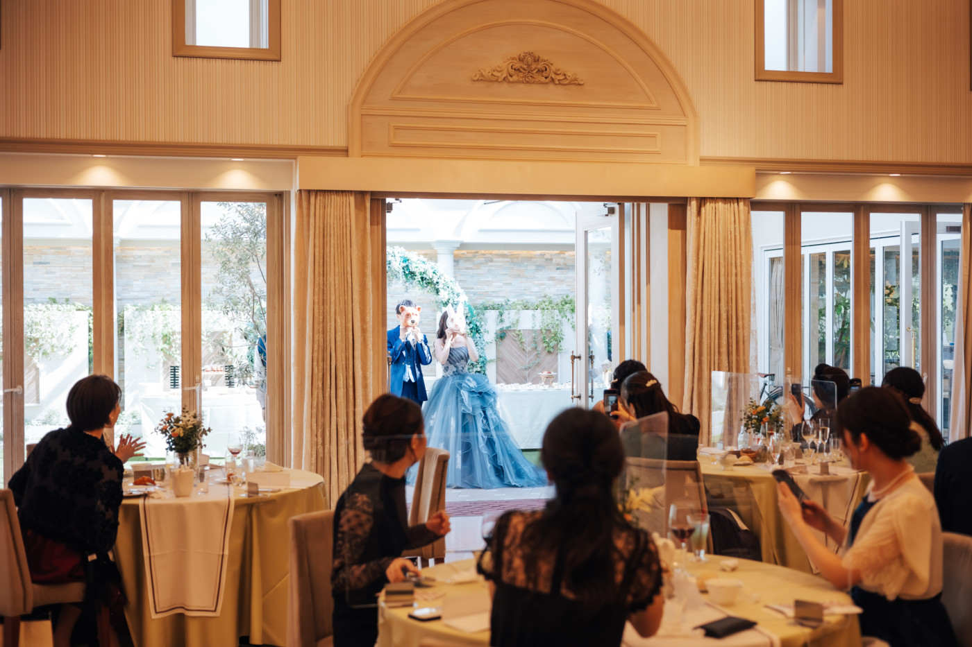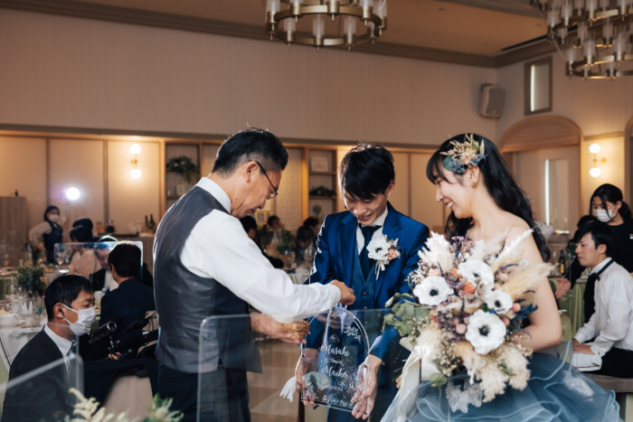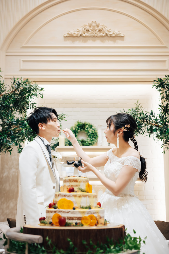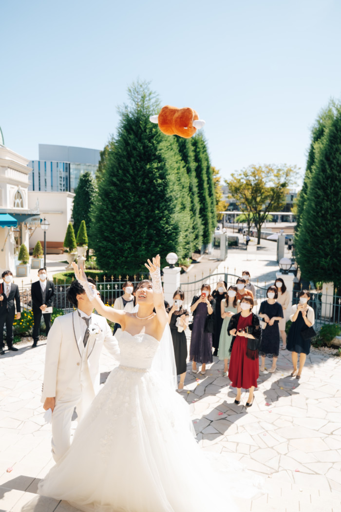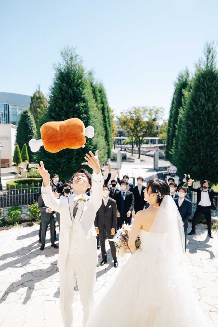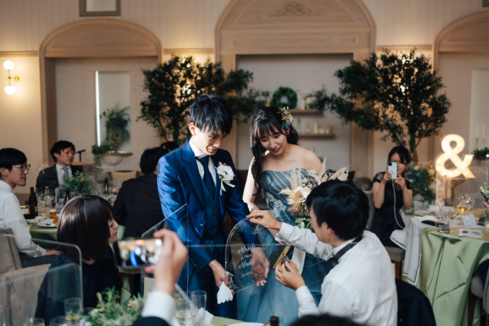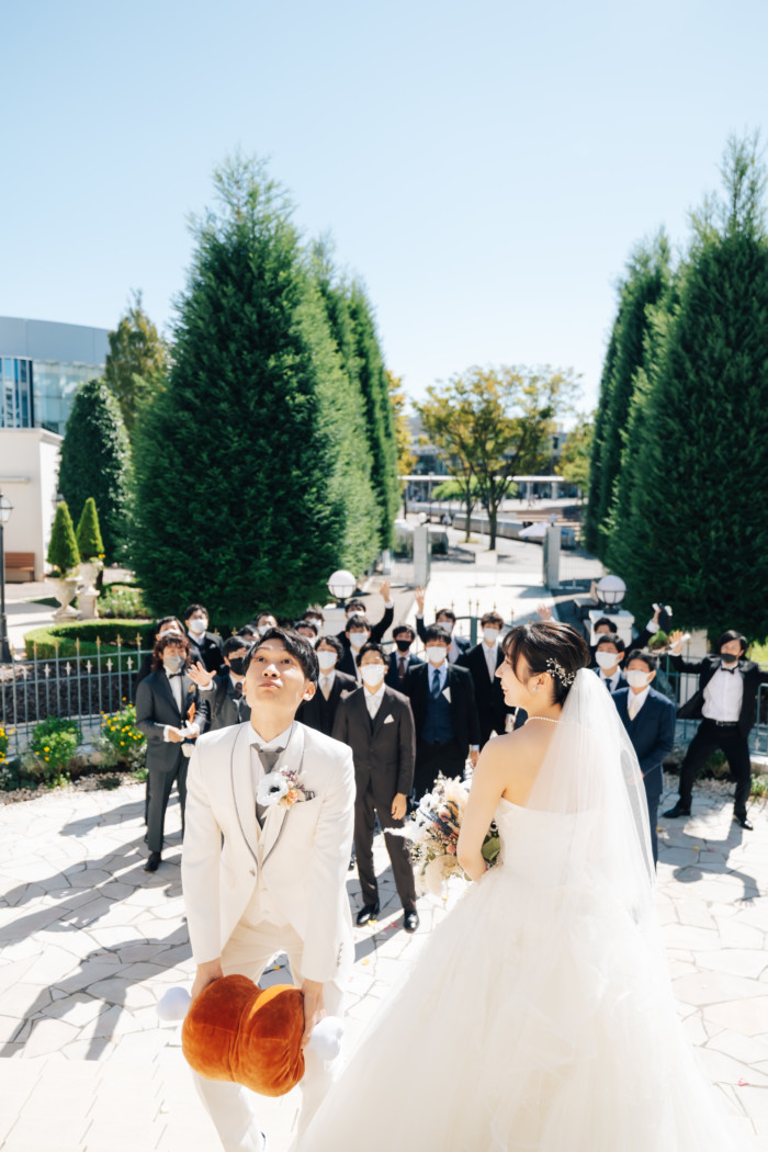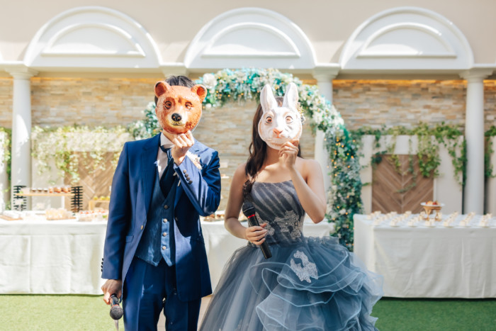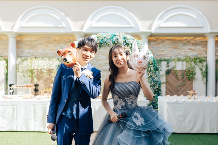 グリーンを基調としたナチュラルな世界観へ。 フラワーシャワー後にはおふたりそれぞれでお肉クッショントス!ドキドキ・ワクワクの演出をご用意! こだわりのウエディングケーキには、可愛らしい動物がかくれんぼをしている自然溢れる空間に♪ 再入場ではウエディングドロップスで各テーブル皆様にご挨拶を…! そしてデザートタイムでは、天の声とともに、お面をかぶったおふたりが登場! 笑顔がたくさん溢れる1日になりました。