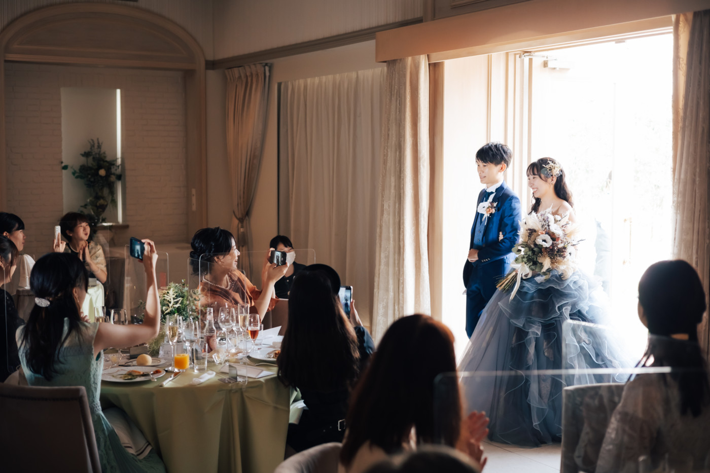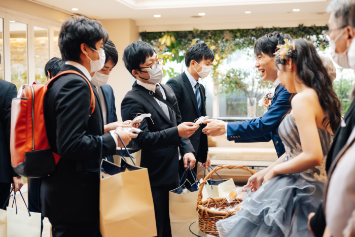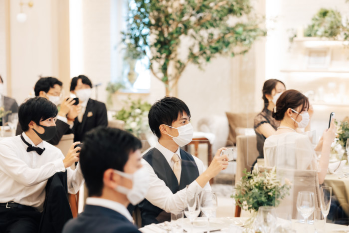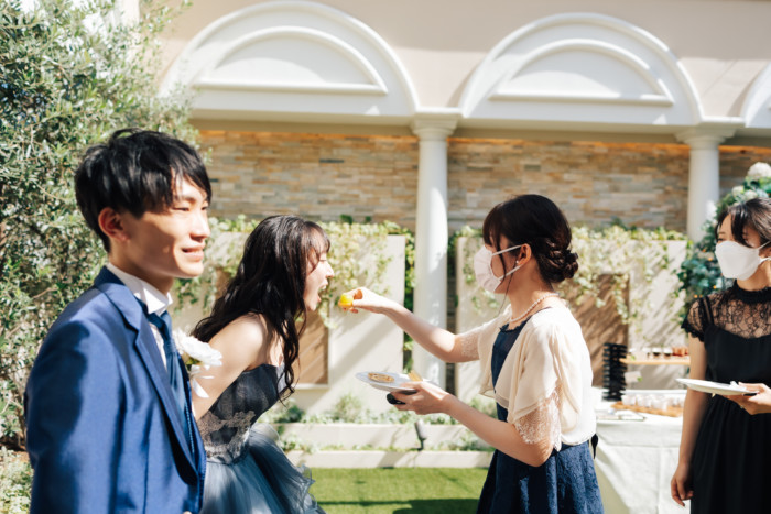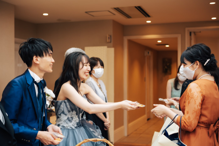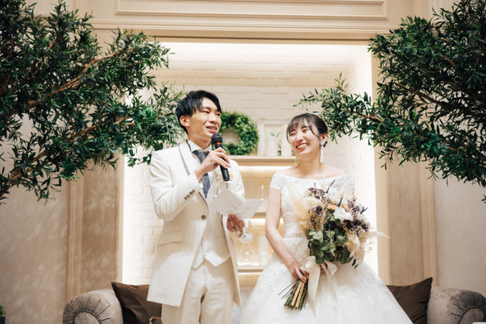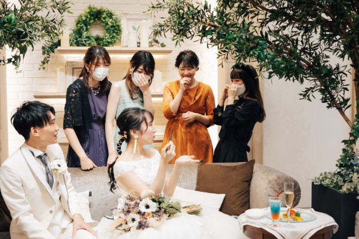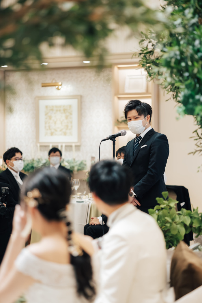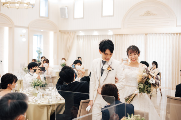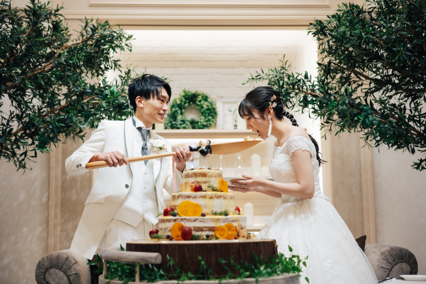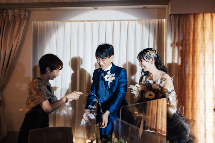 グリーンを基調としたナチュラルな世界観へ。 フラワーシャワー後にはおふたりそれぞれでお肉クッショントス!ドキドキ・ワクワクの演出をご用意! こだわりのウエディングケーキには、可愛らしい動物がかくれんぼをしている自然溢れる空間に♪ 再入場ではウエディングドロップスで各テーブル皆様にご挨拶を…! そしてデザートタイムでは、天の声とともに、お面をかぶったおふたりが登場! 笑顔がたくさん溢れる1日になりました。