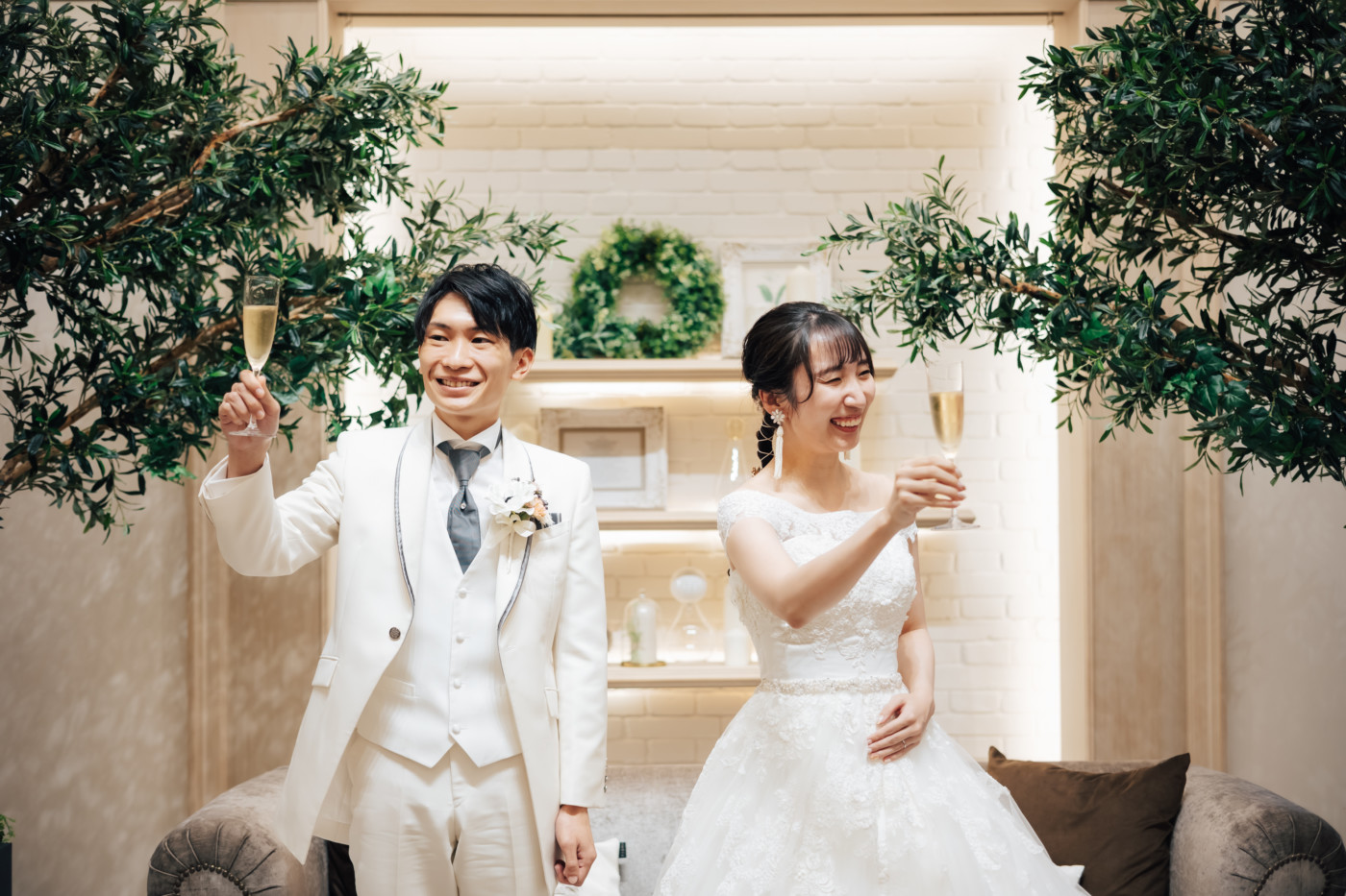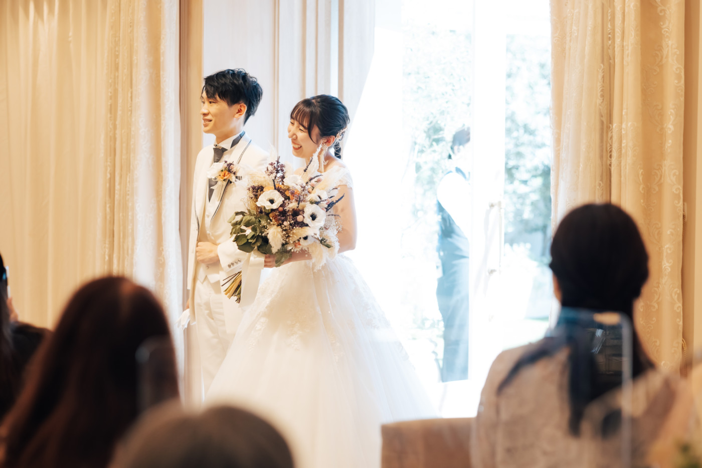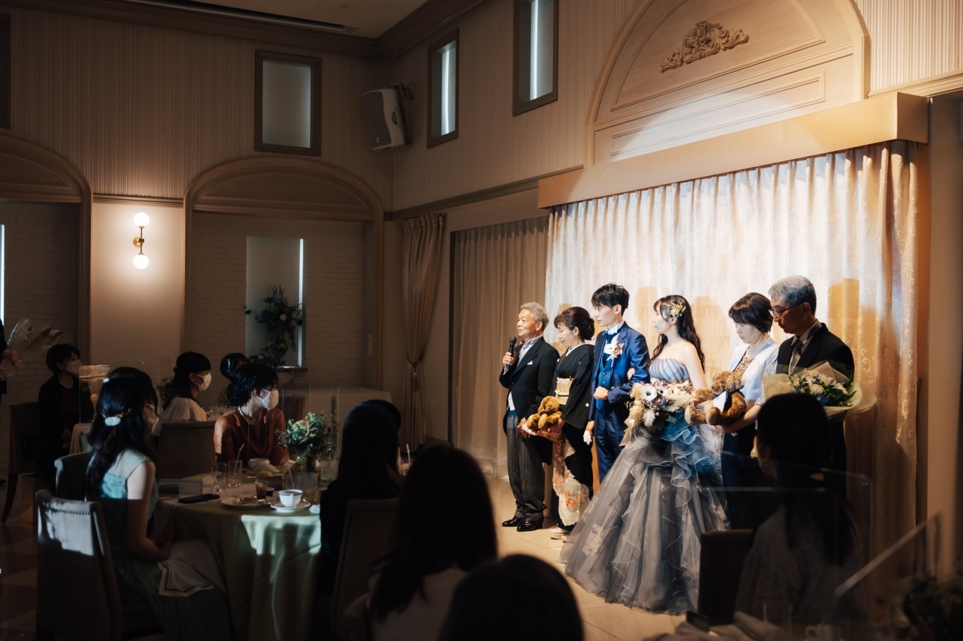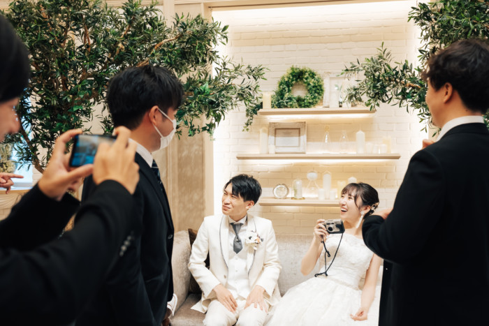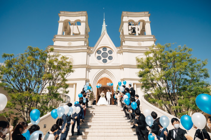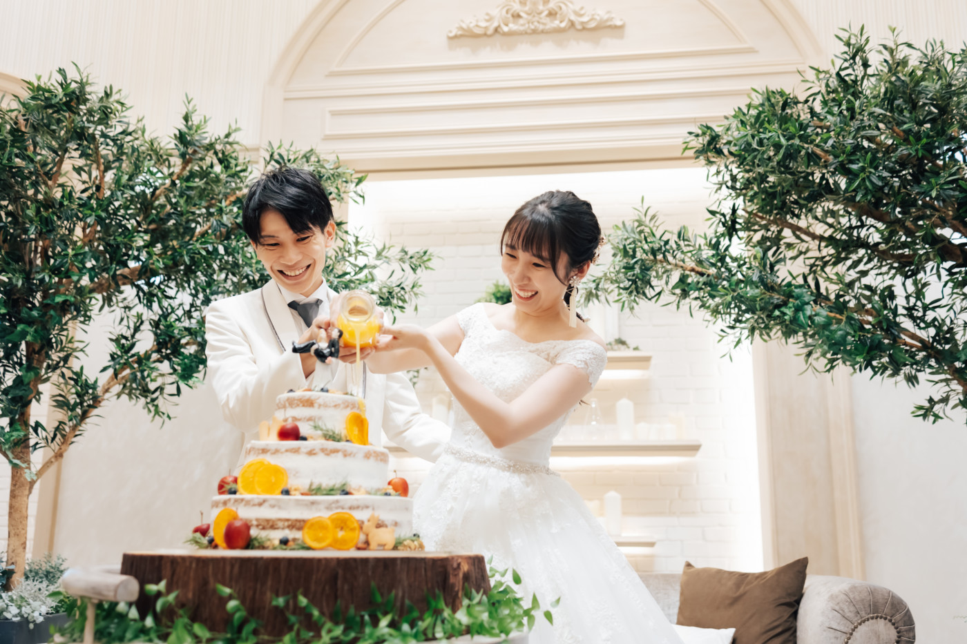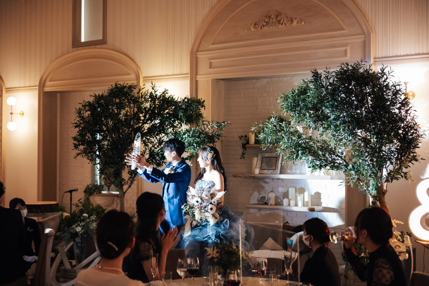 グリーンを基調としたナチュラルな世界観へ。 フラワーシャワー後にはおふたりそれぞれでお肉クッショントス!ドキドキ・ワクワクの演出をご用意! こだわりのウエディングケーキには、可愛らしい動物がかくれんぼをしている自然溢れる空間に♪ 再入場ではウエディングドロップスで各テーブル皆様にご挨拶を…! そしてデザートタイムでは、天の声とともに、お面をかぶったおふたりが登場! 笑顔がたくさん溢れる1日になりました。