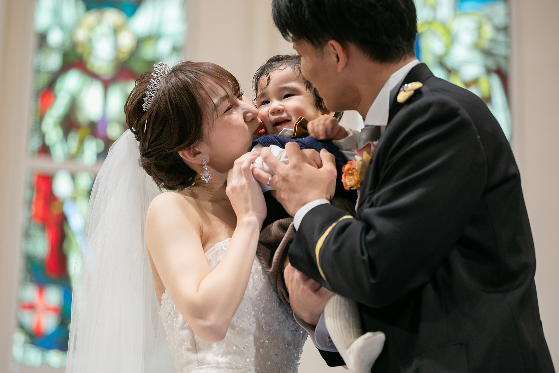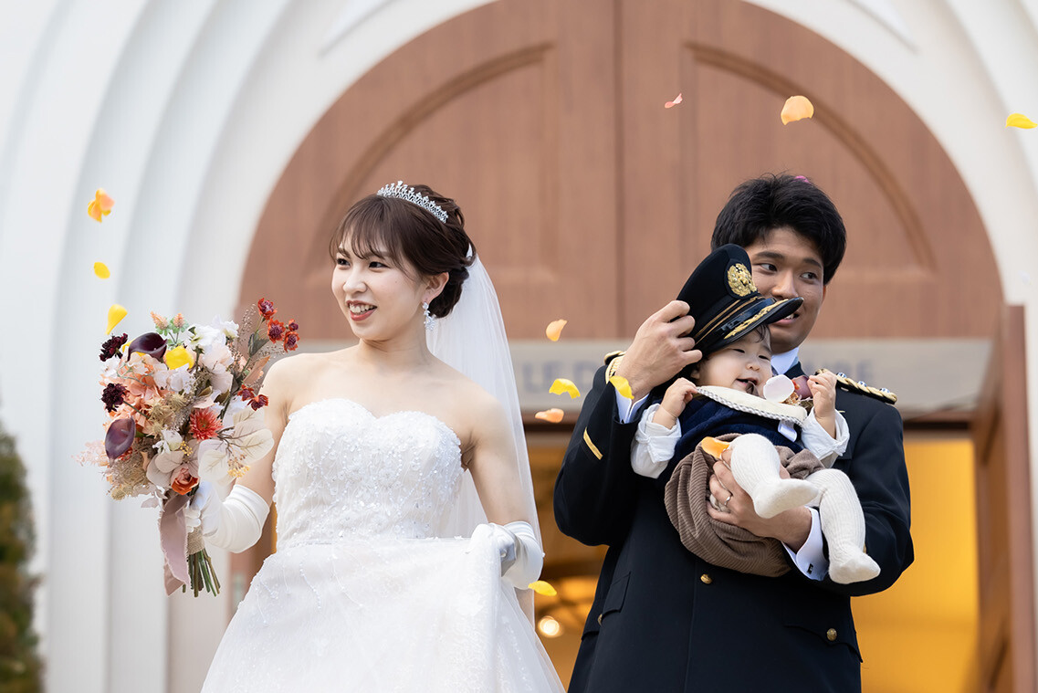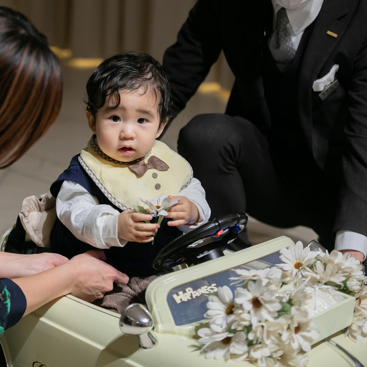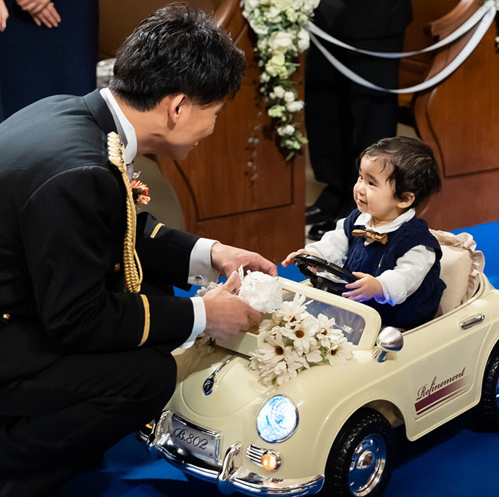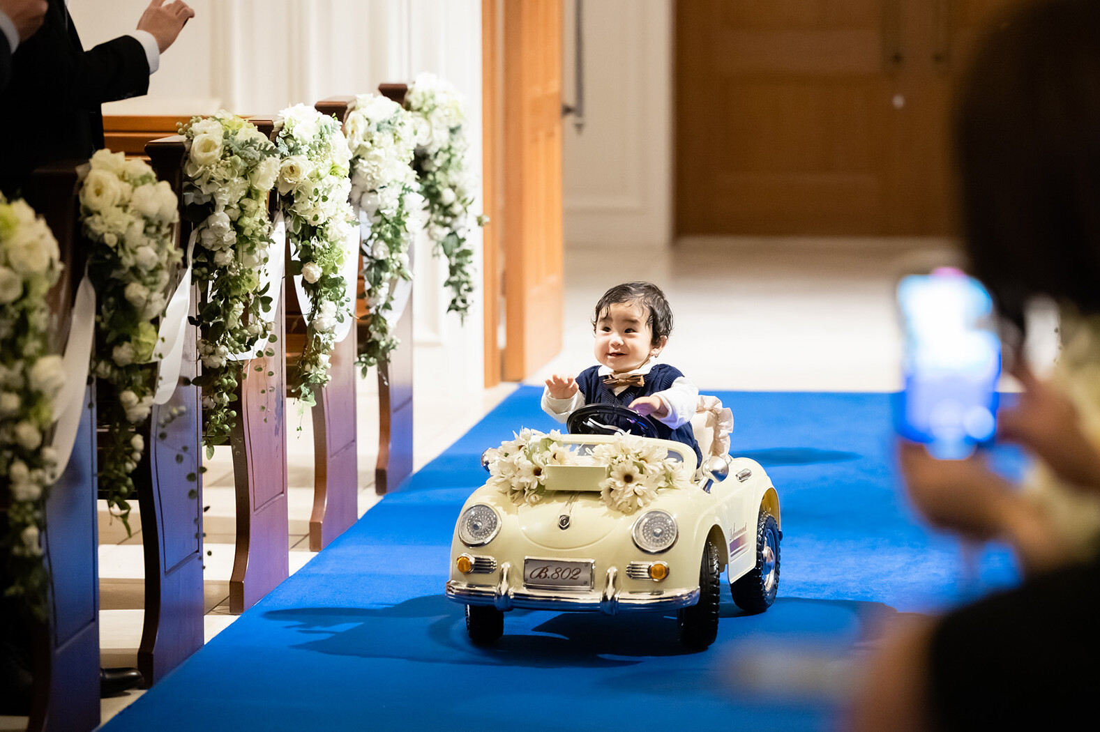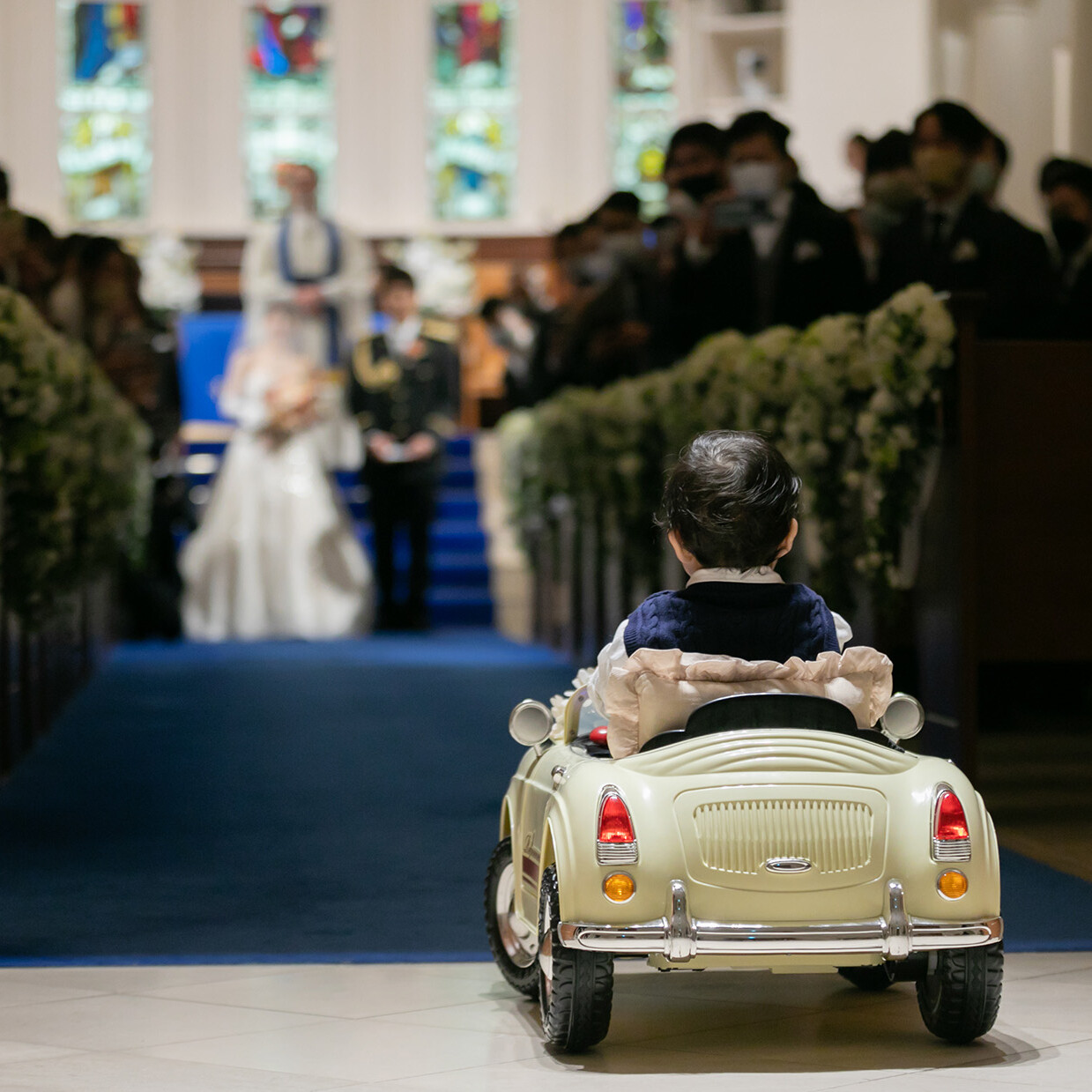 おふたりには可愛い男の子が一人 ご結婚式当日も一緒に楽しみたい、それがおふたりの想いでした リングボーイやフラワーシャワーでの登場 ご披露宴でのお席もソファスタイルに変え、 できる限り一緒に過ごせるようにされました また、ケーキや装花、席次表など細部にも力を入れ こだわり抜いたご新婦 写真に映り込むアイテムはどれもお写真により華を添えてくれています
