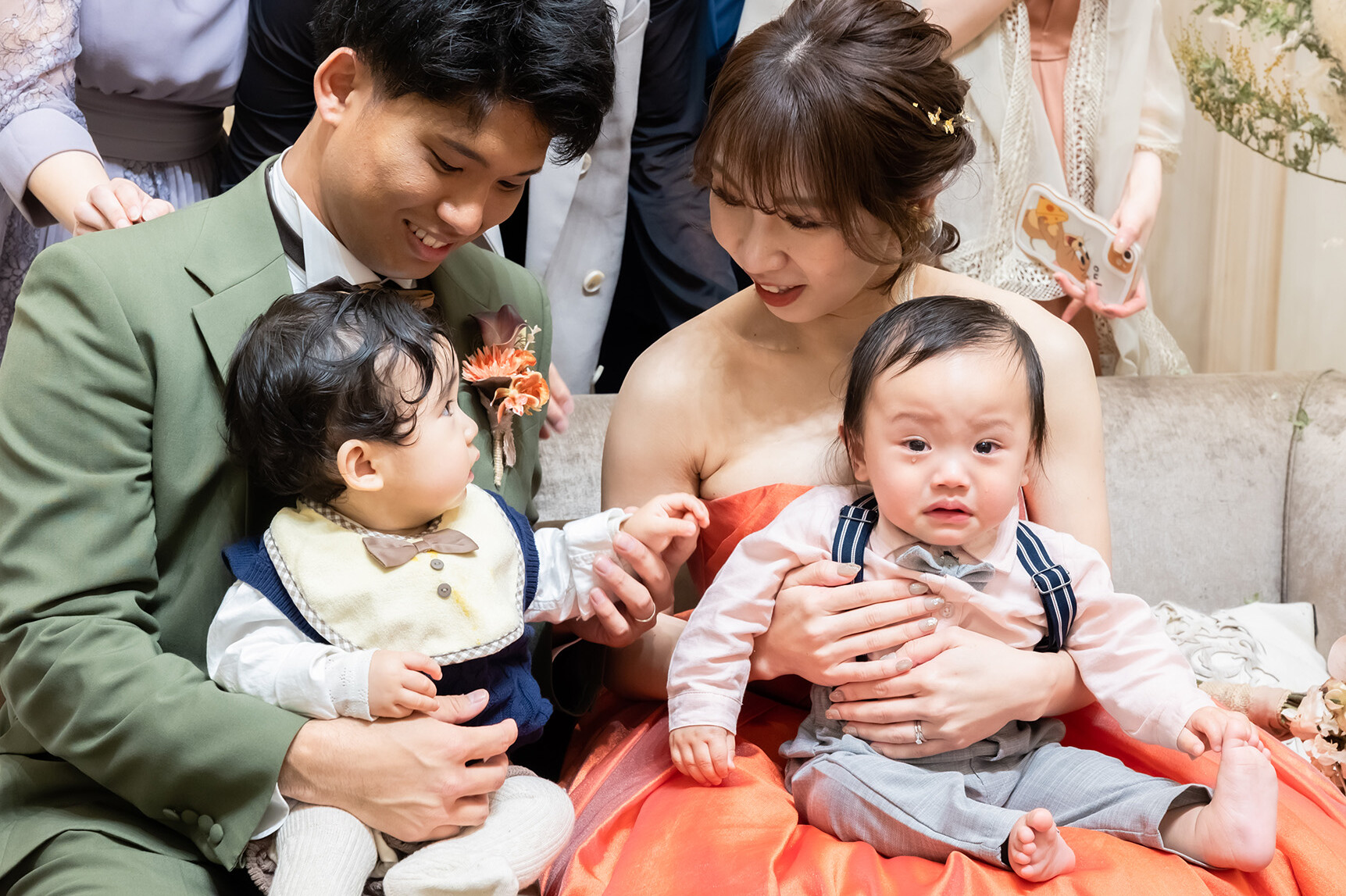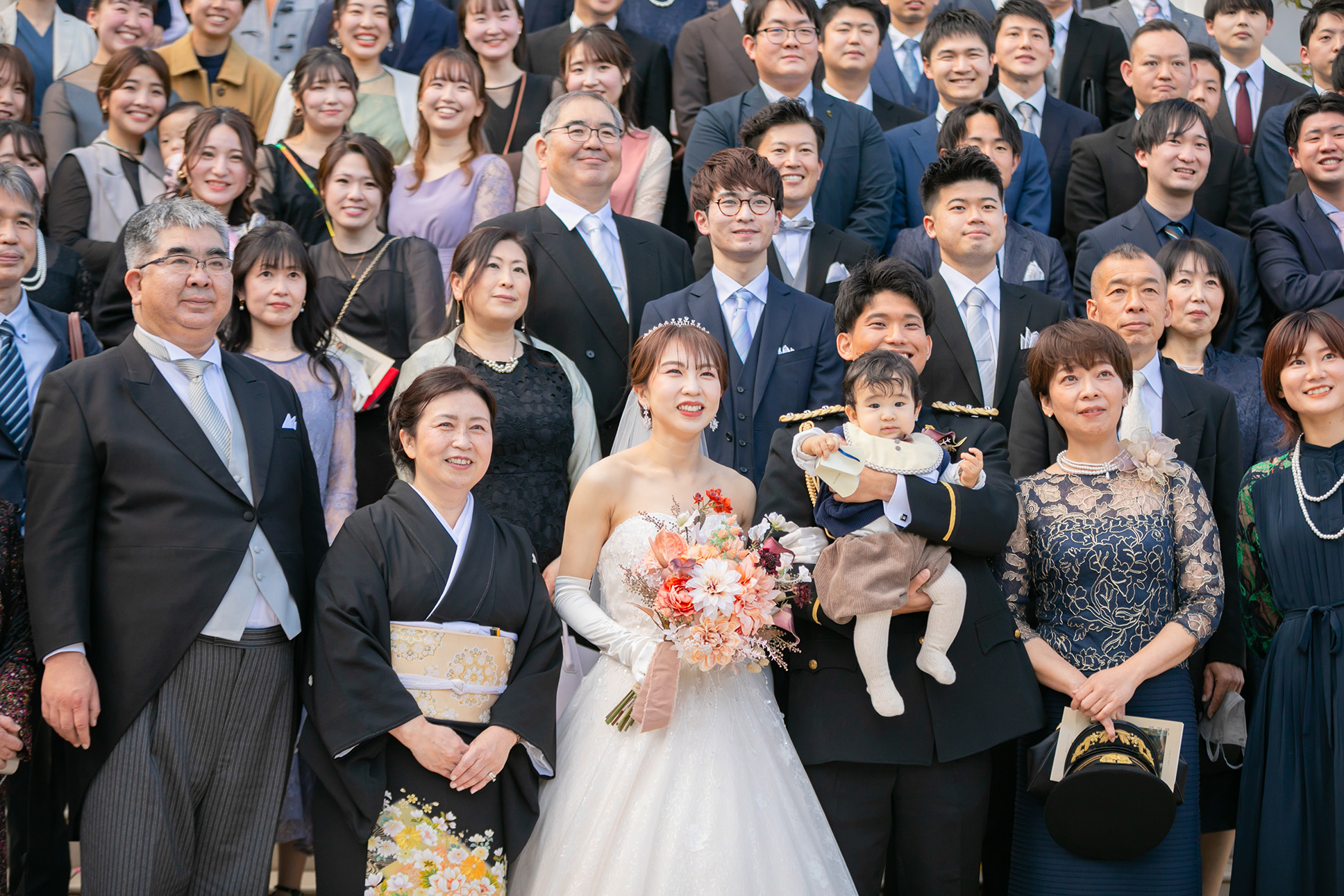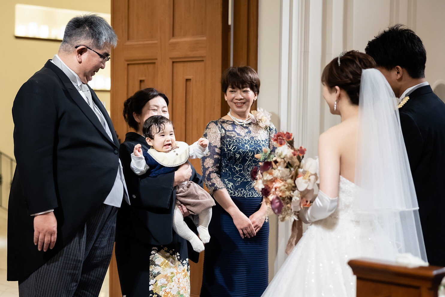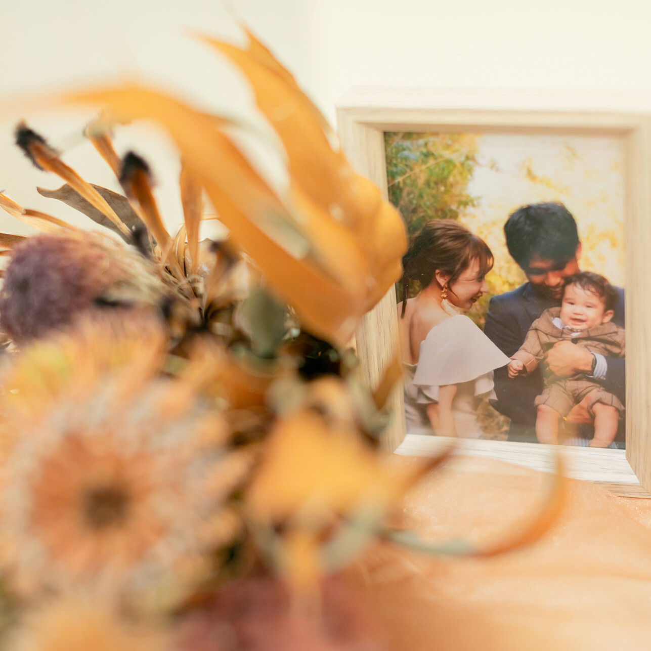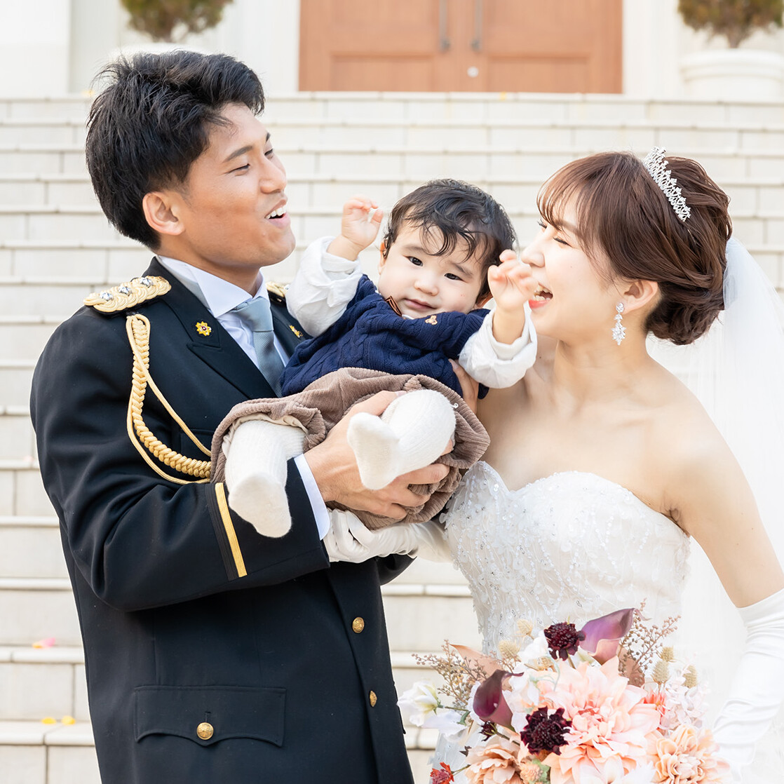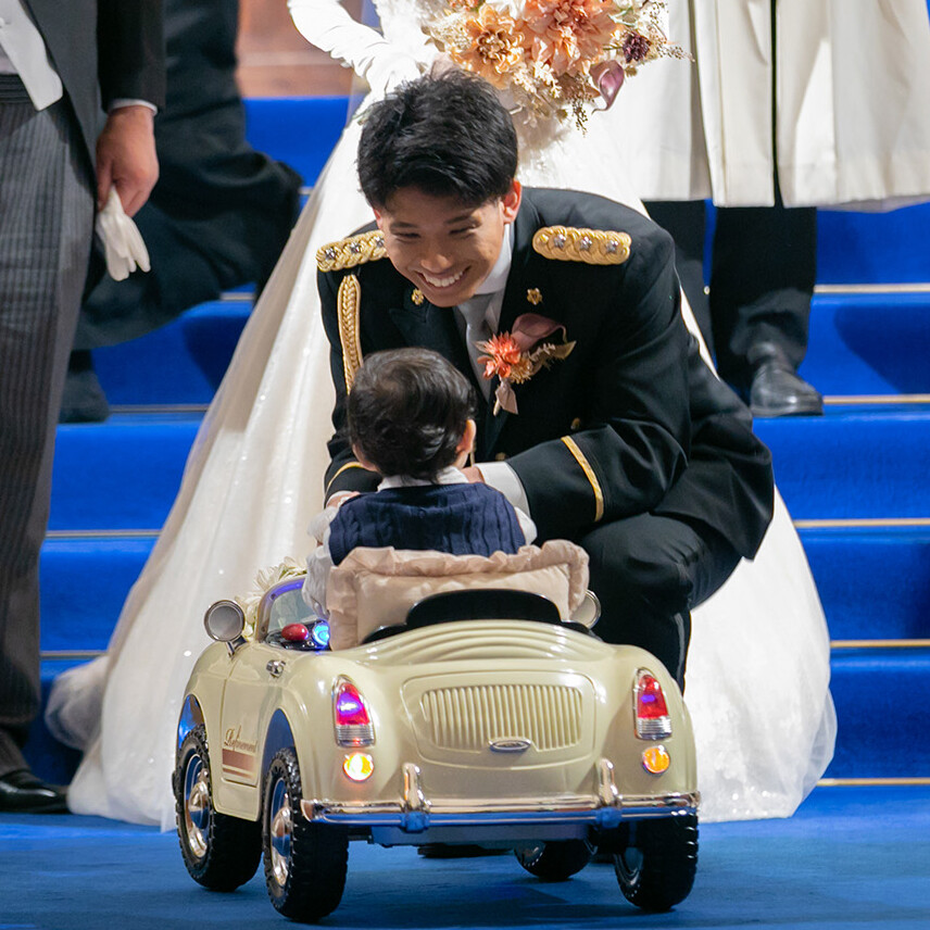 おふたりには可愛い男の子が一人 ご結婚式当日も一緒に楽しみたい、それがおふたりの想いでした リングボーイやフラワーシャワーでの登場 ご披露宴でのお席もソファスタイルに変え、 できる限り一緒に過ごせるようにされました また、ケーキや装花、席次表など細部にも力を入れ こだわり抜いたご新婦 写真に映り込むアイテムはどれもお写真により華を添えてくれています