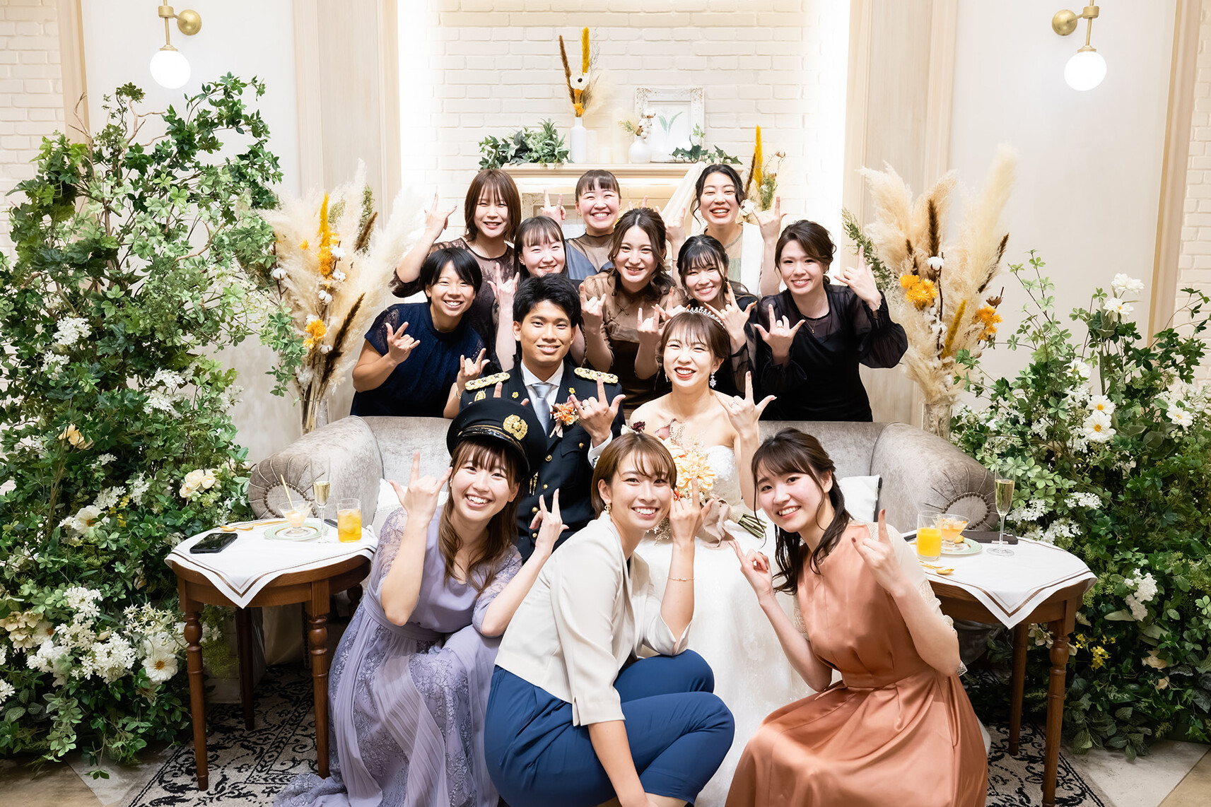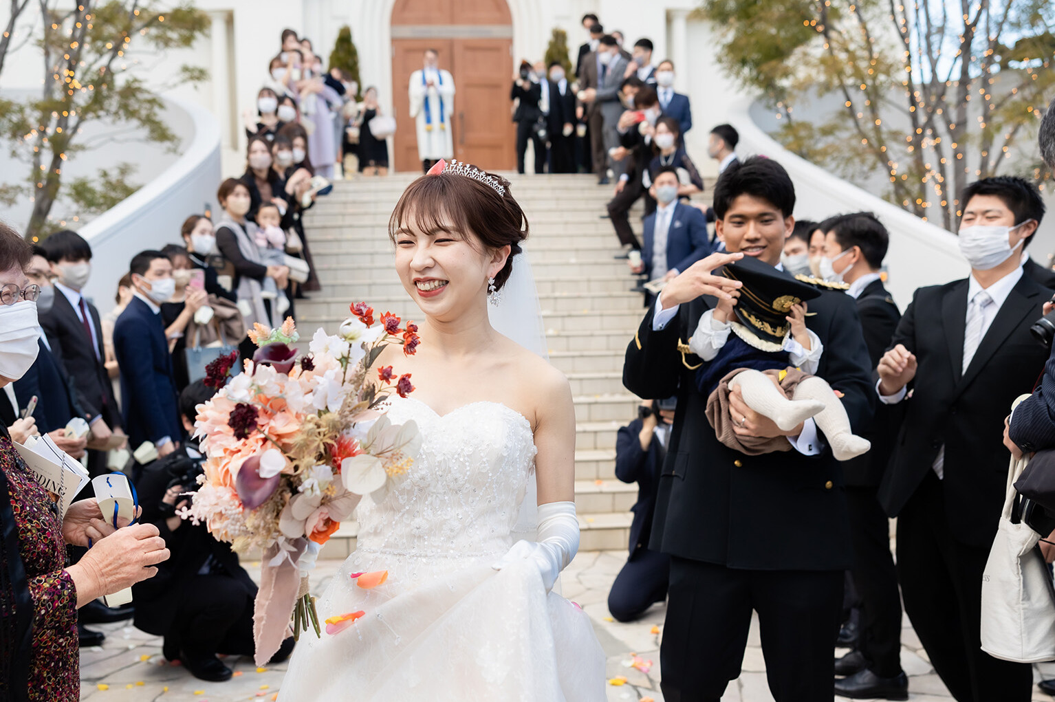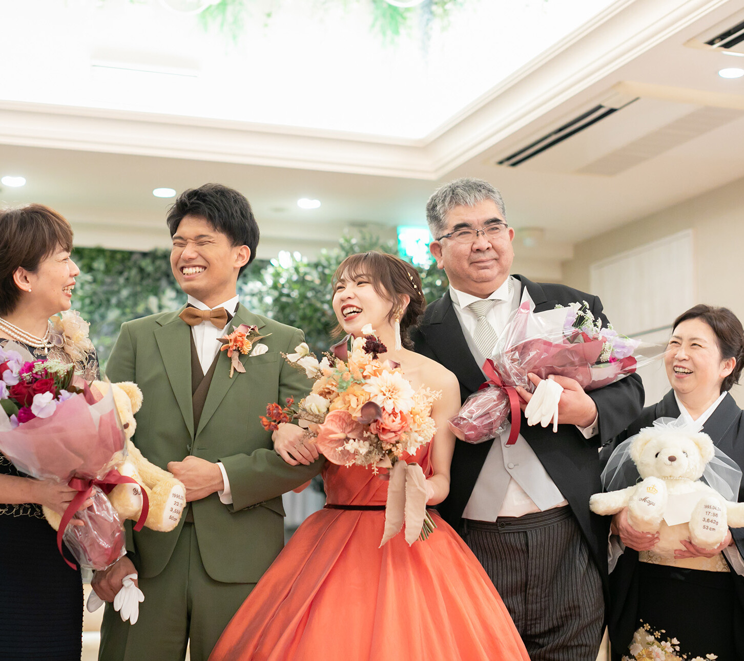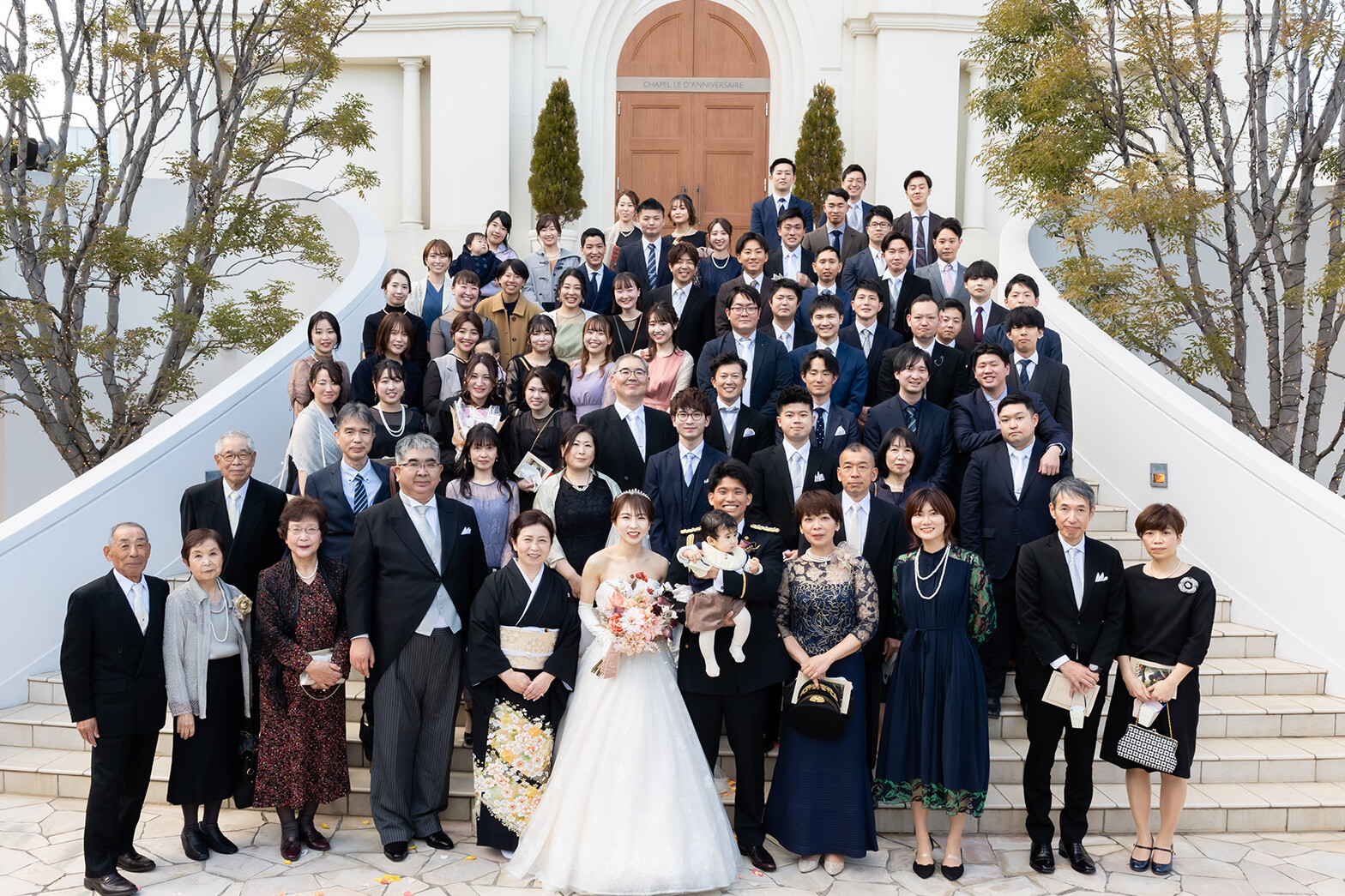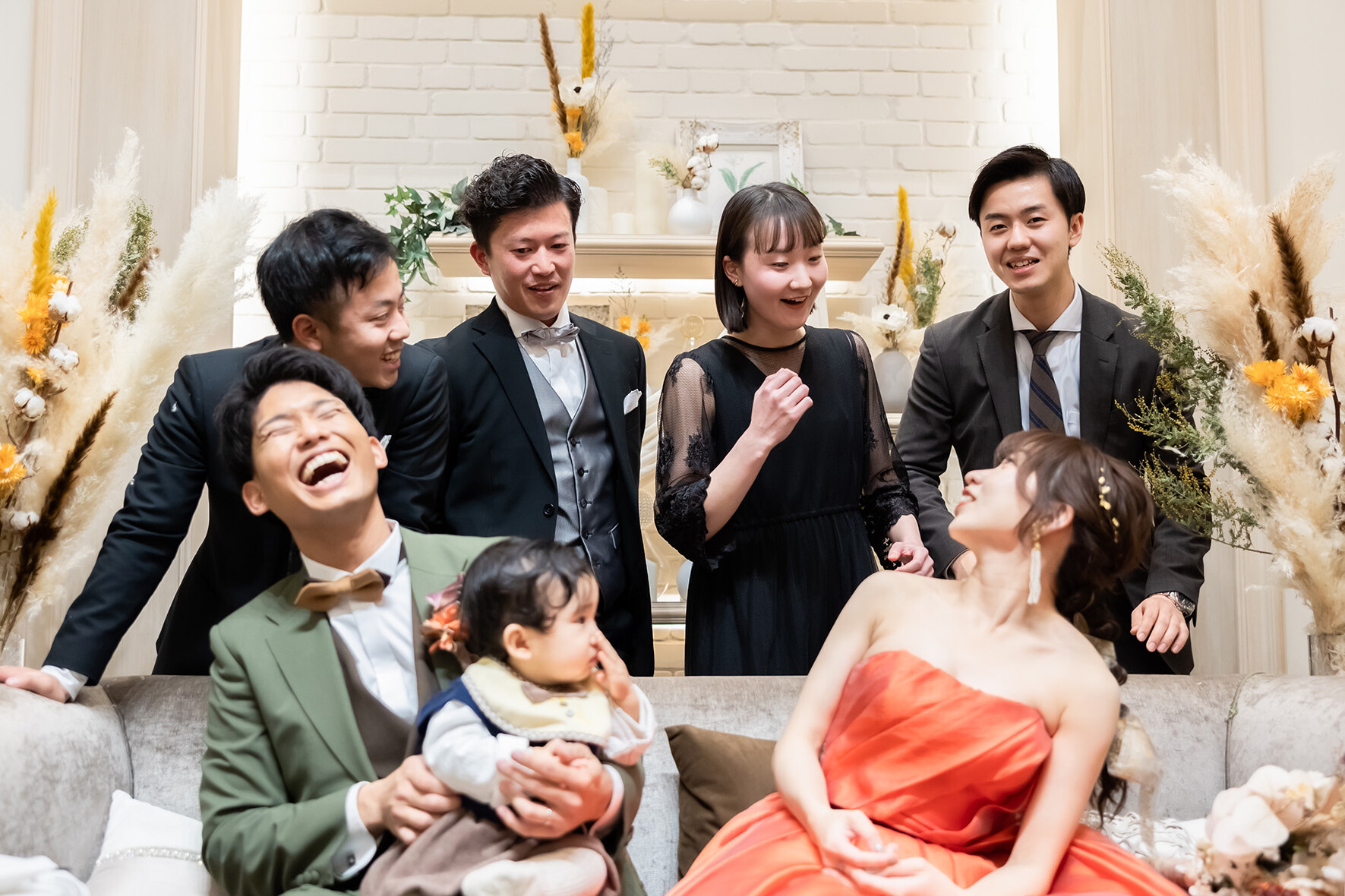 おふたりには可愛い男の子が一人 ご結婚式当日も一緒に楽しみたい、それがおふたりの想いでした リングボーイやフラワーシャワーでの登場 ご披露宴でのお席もソファスタイルに変え、 できる限り一緒に過ごせるようにされました また、ケーキや装花、席次表など細部にも力を入れ こだわり抜いたご新婦 写真に映り込むアイテムはどれもお写真により華を添えてくれています