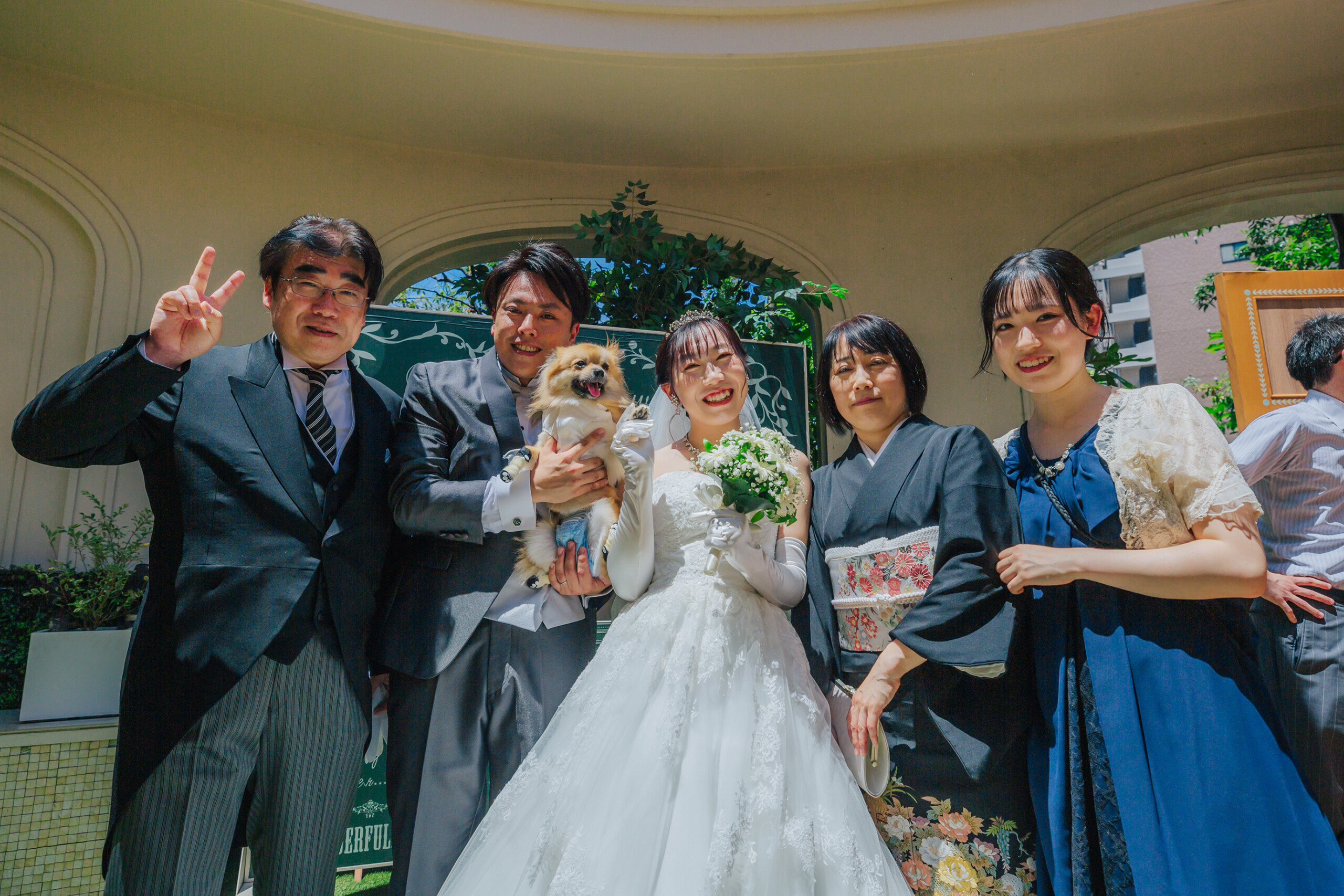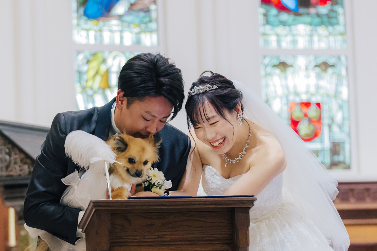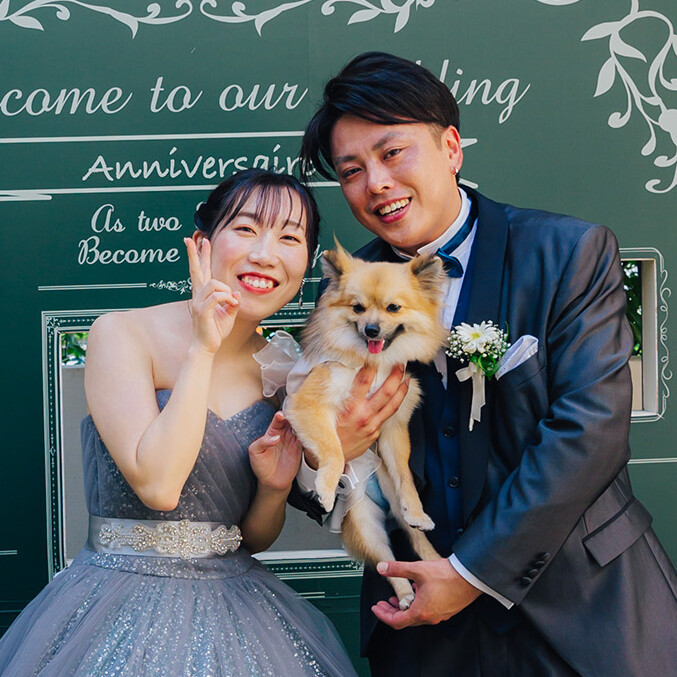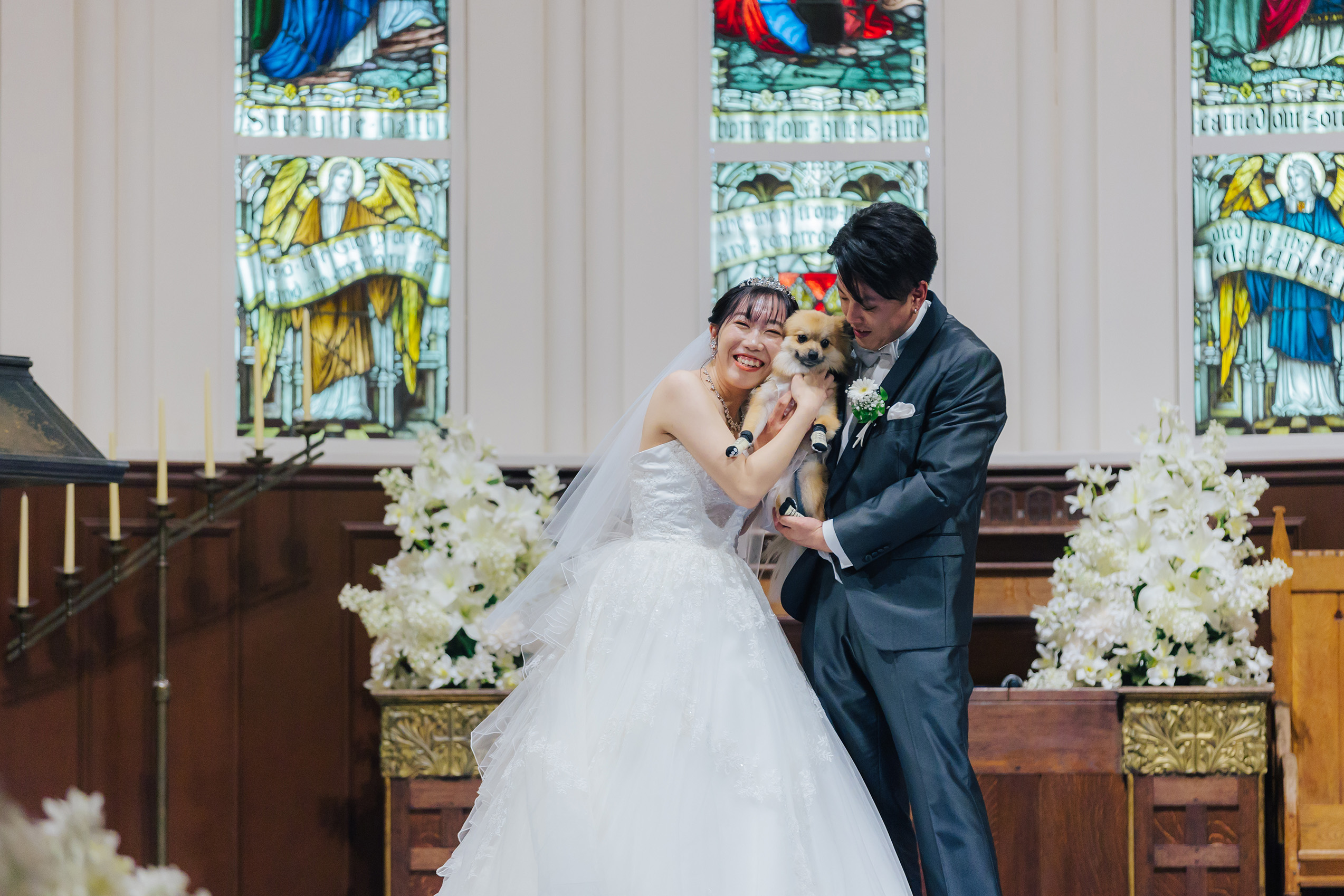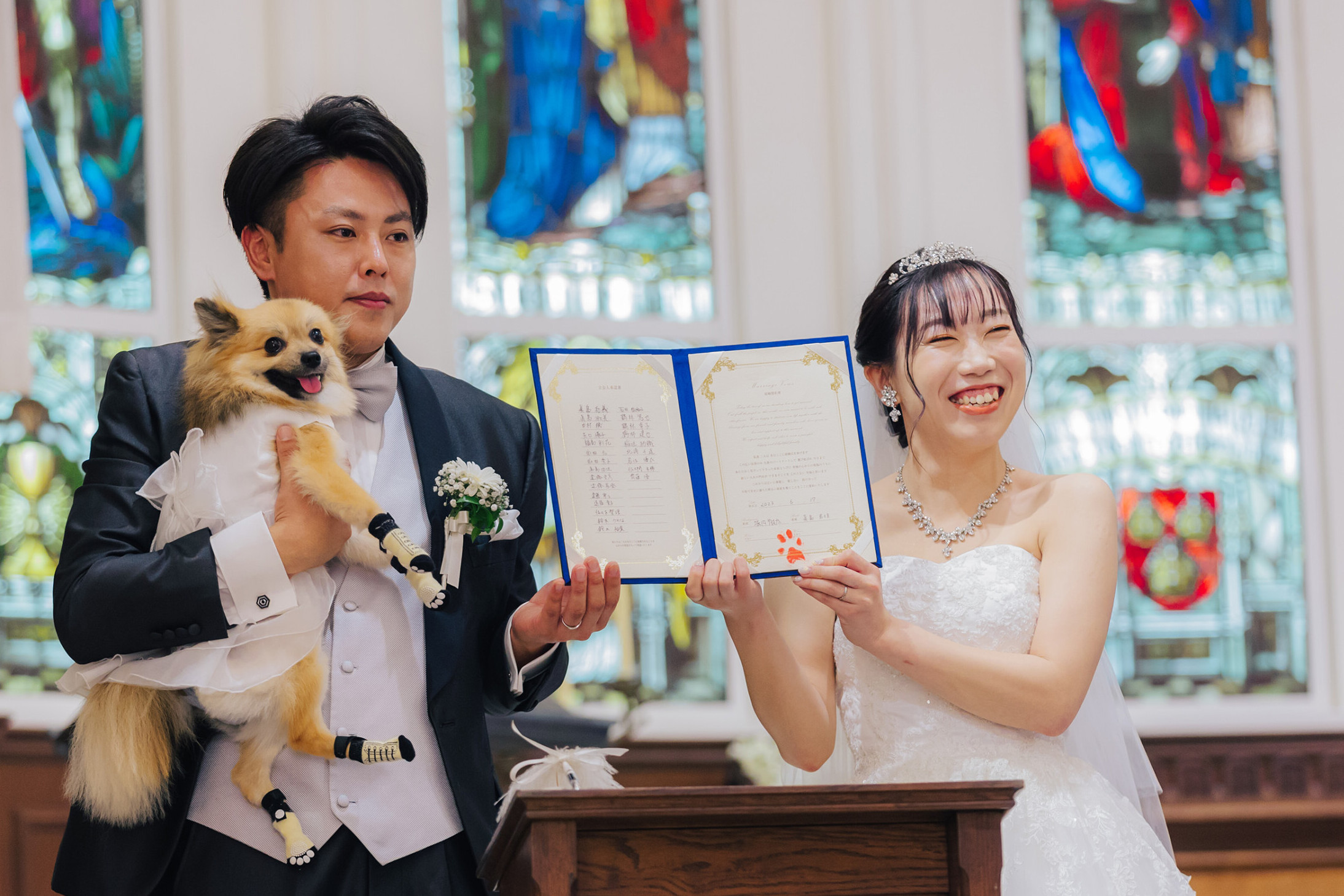 ポメラニアンの「ういちゃん」と一緒に叶えるご結婚式 リングドックや肉球署名、披露宴の時間もガーデンパーティを行い お庭で写真を撮って一緒に過ごしました