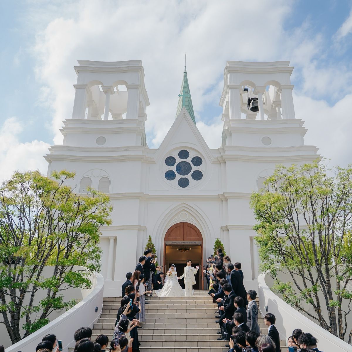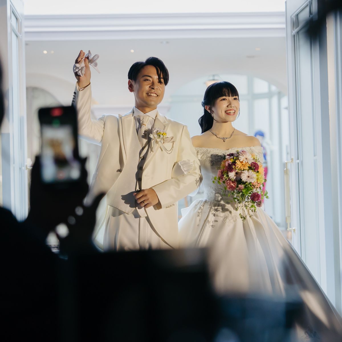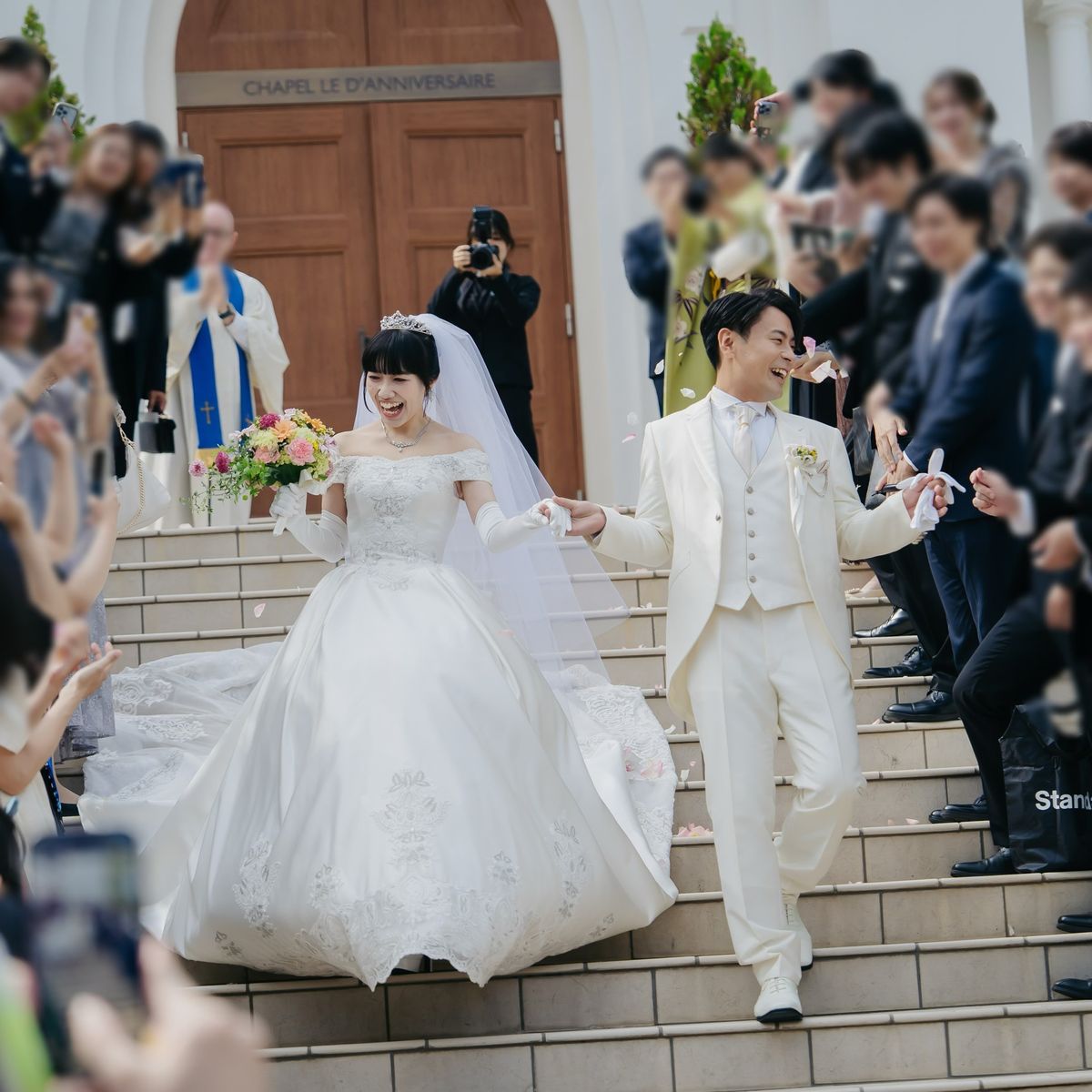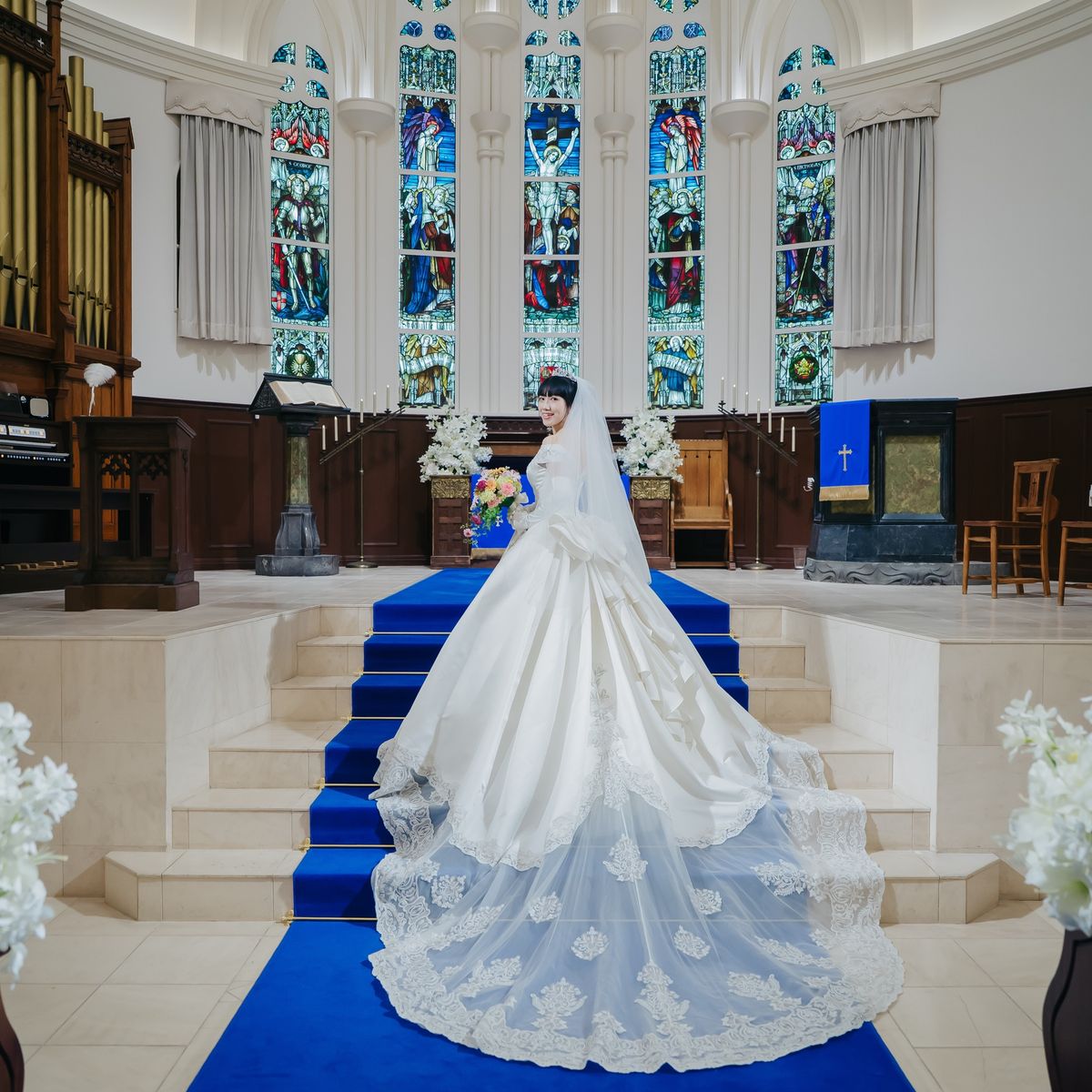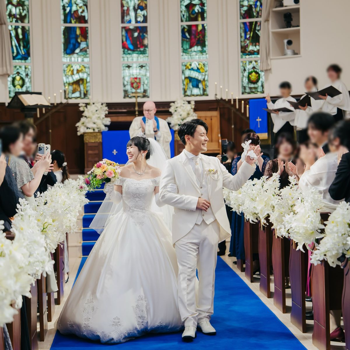 式場選びの決め手にもなった、青いバージンロードが魅力の独立型チャペルでの挙式。ステンドグラス越しに差し込む光がドレスやレースの刺繍を際立たせ、前撮りや当日の写真をとても綺麗に残していただけました。階段の先の壇上はゲストからも見やすい構造です。誓いのあとのフラワーシャワーも、青空の下で幸せを実感する時間に。また、キリスト教式のスタイルと英語・日本語での進行は、海外出身のゲストに喜んでいただけました。