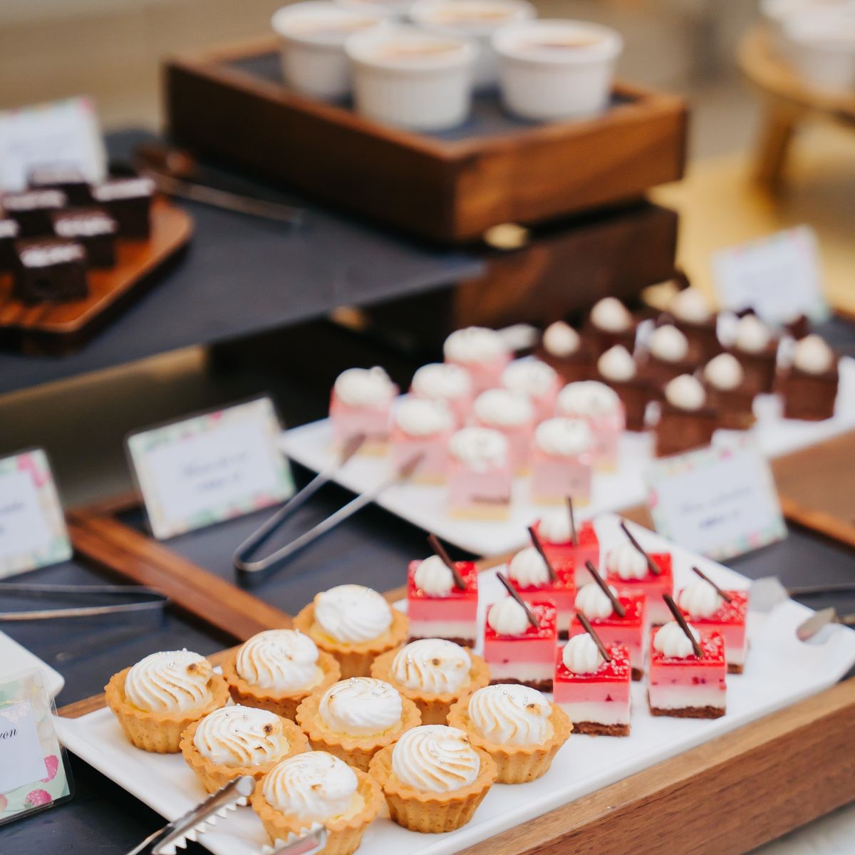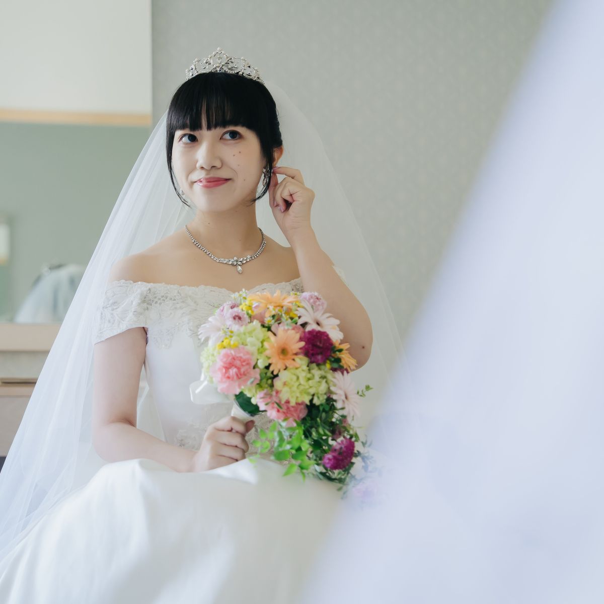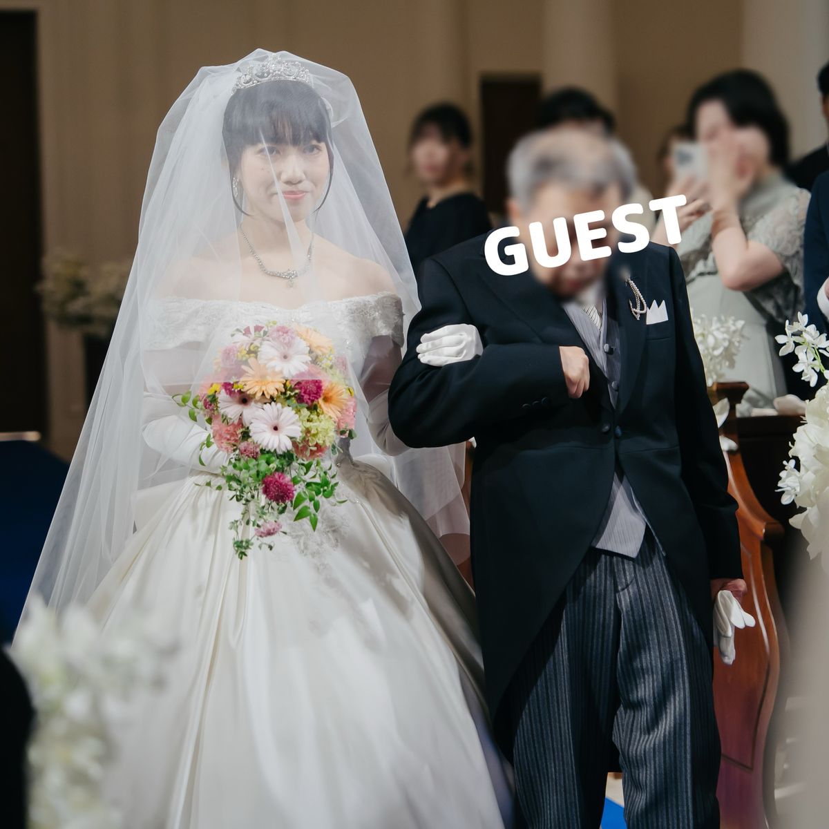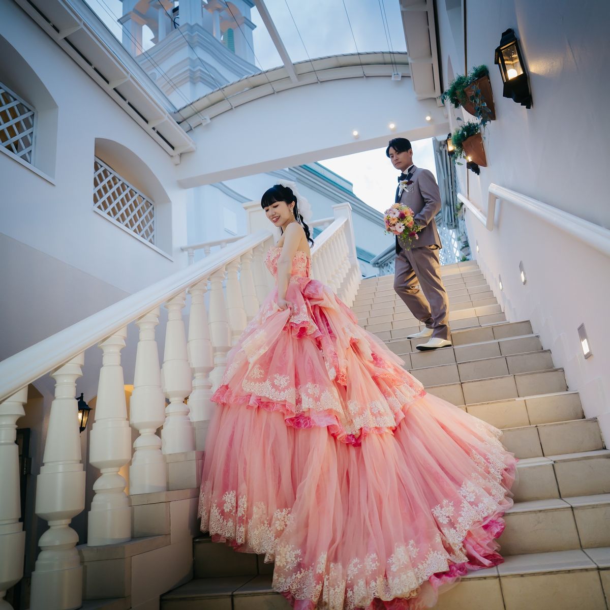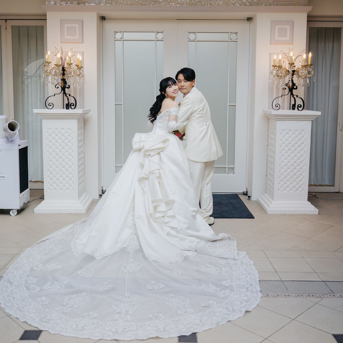 式場選びの決め手にもなった、青いバージンロードが魅力の独立型チャペルでの挙式。ステンドグラス越しに差し込む光がドレスやレースの刺繍を際立たせ、前撮りや当日の写真をとても綺麗に残していただけました。階段の先の壇上はゲストからも見やすい構造です。誓いのあとのフラワーシャワーも、青空の下で幸せを実感する時間に。また、キリスト教式のスタイルと英語・日本語での進行は、海外出身のゲストに喜んでいただけました。
