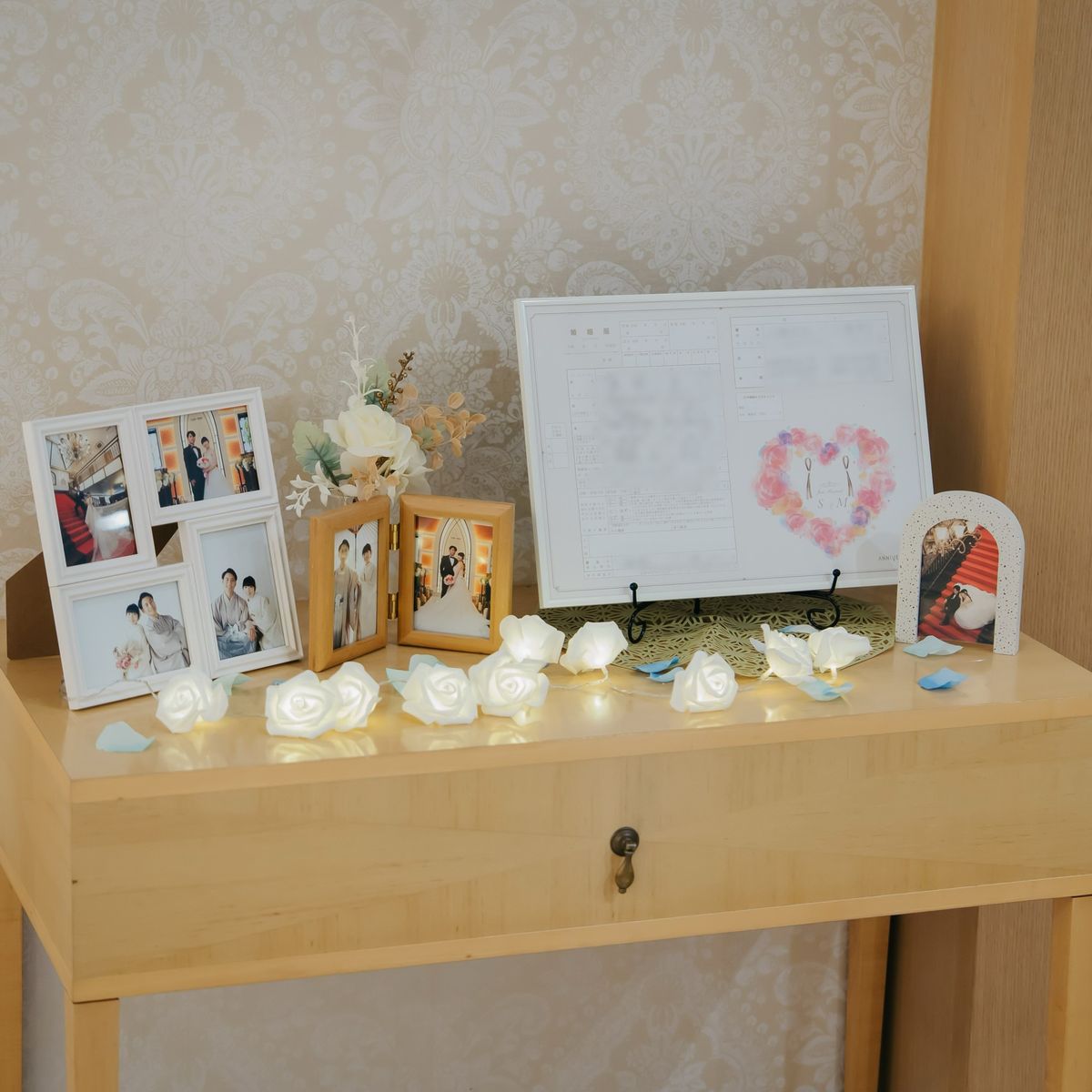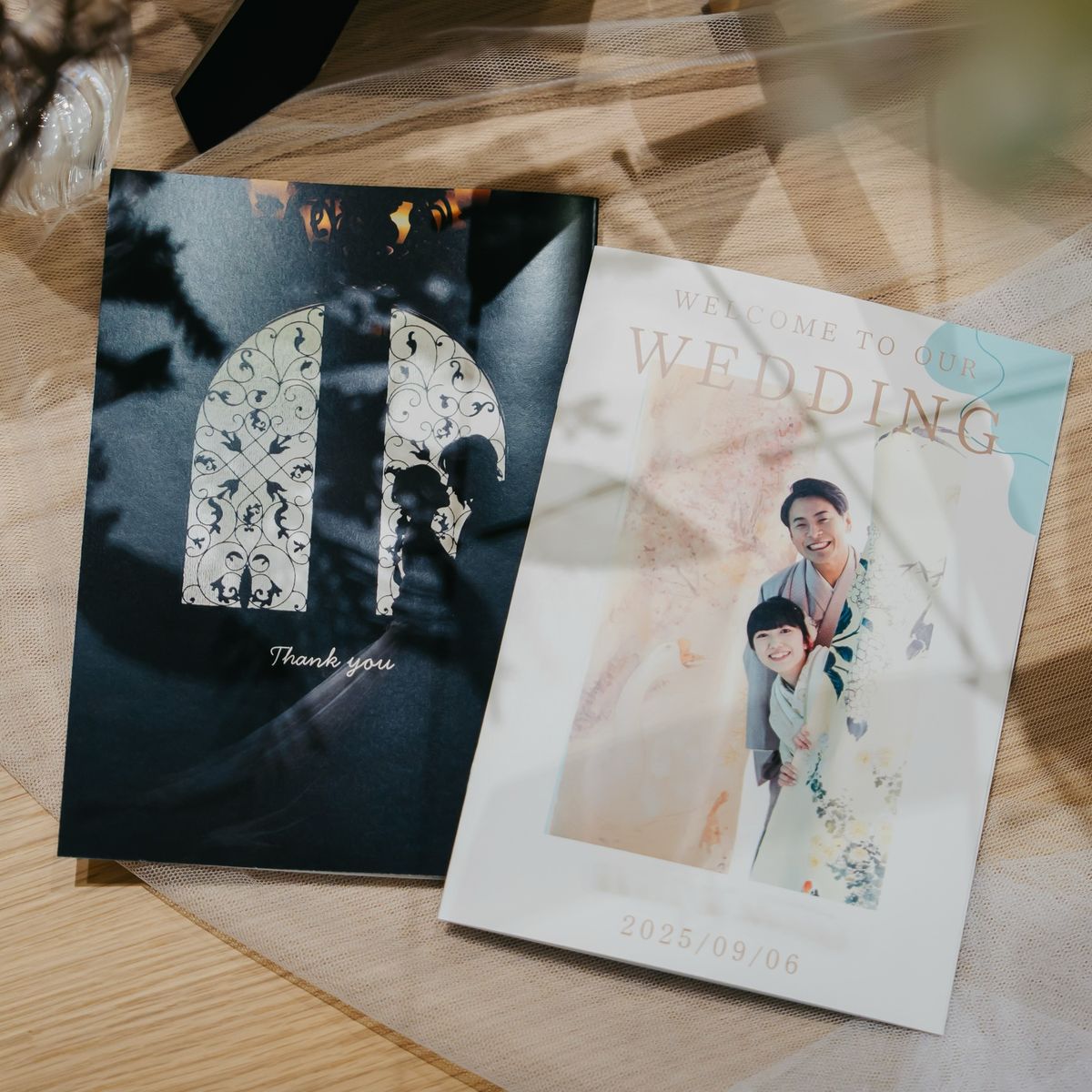 様々なアイテムを自作されたおふたり。特にムービーは時間をかけて制作され、ダイエットのBefore Afterの写真を入れるなど、ユーモアのある構成に。BGM打ち合わせでは好きなアニメの話で盛り上がり、曲もスムーズに決まっていきました。席札やプロフィールブックも自作し、裏にゲストへのメッセージを手書きで添えるなど、工夫を重ねて準備をされていたのが印象的です。