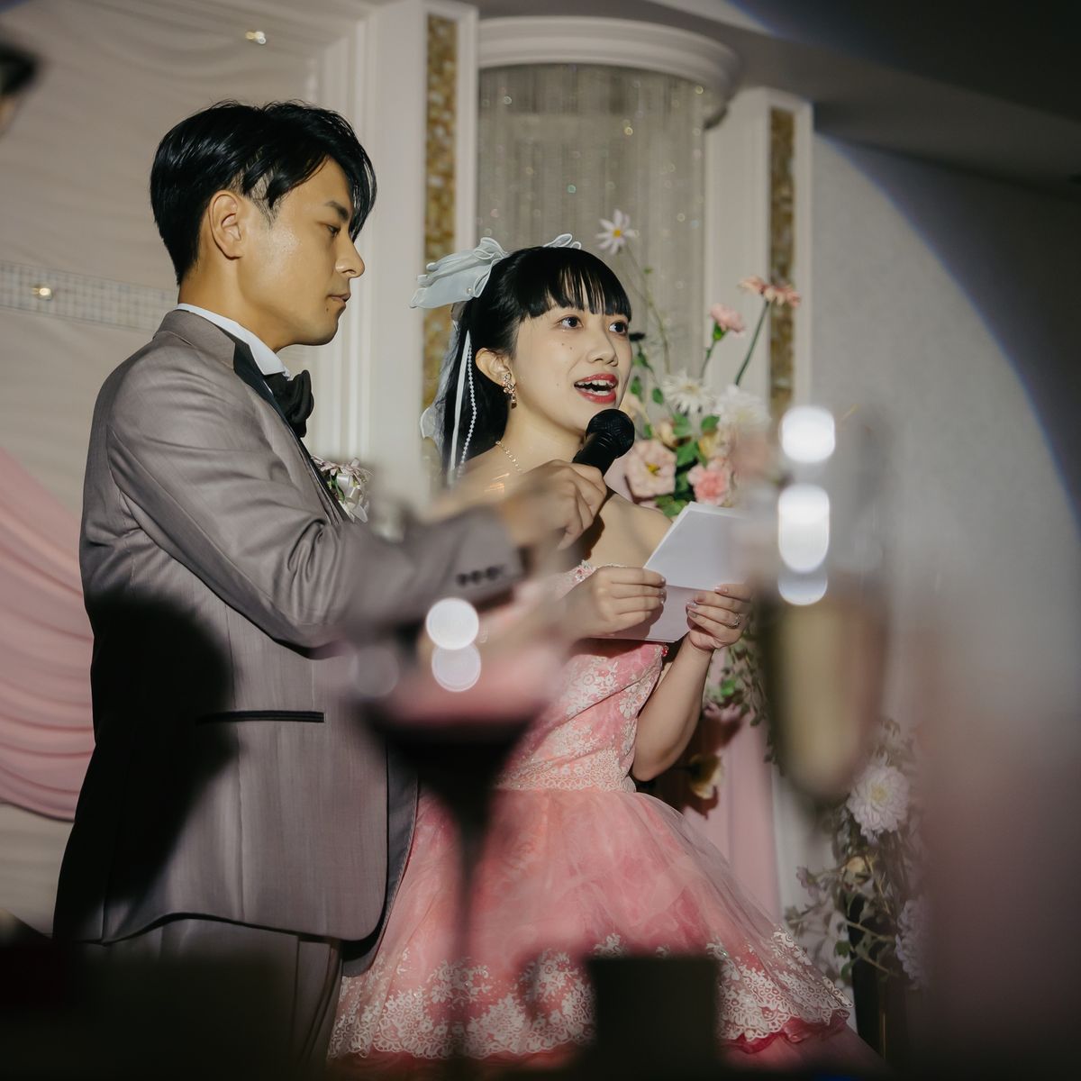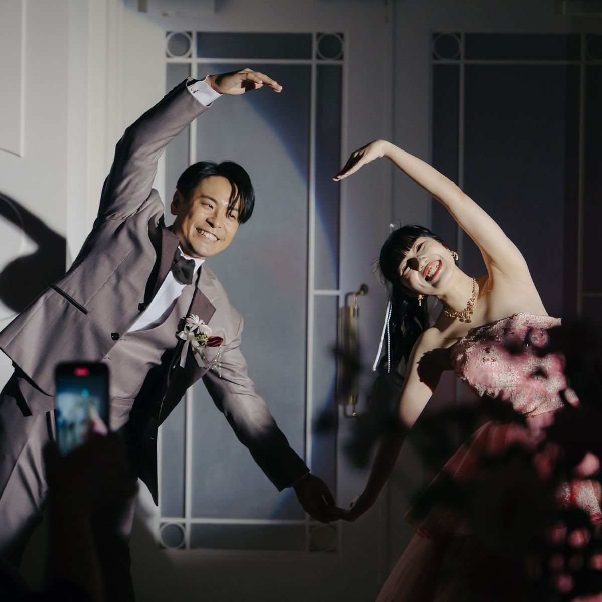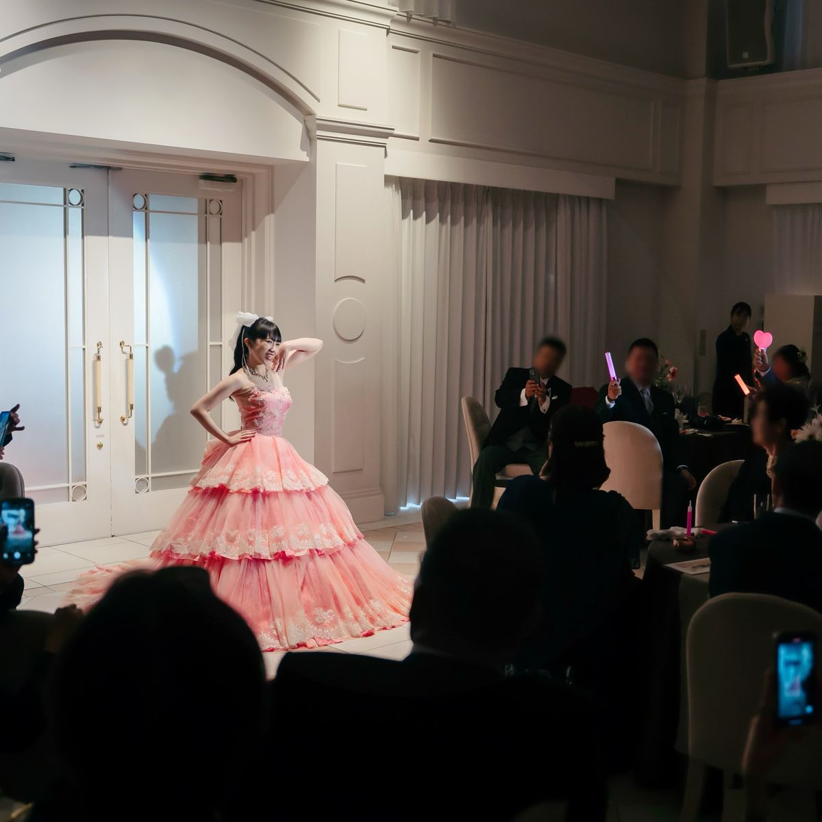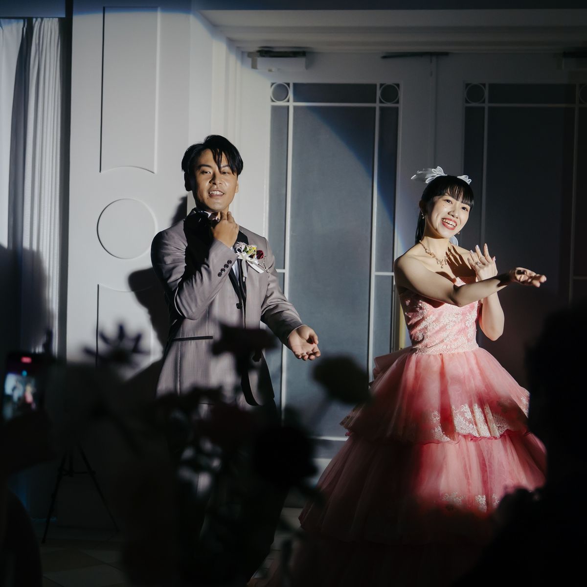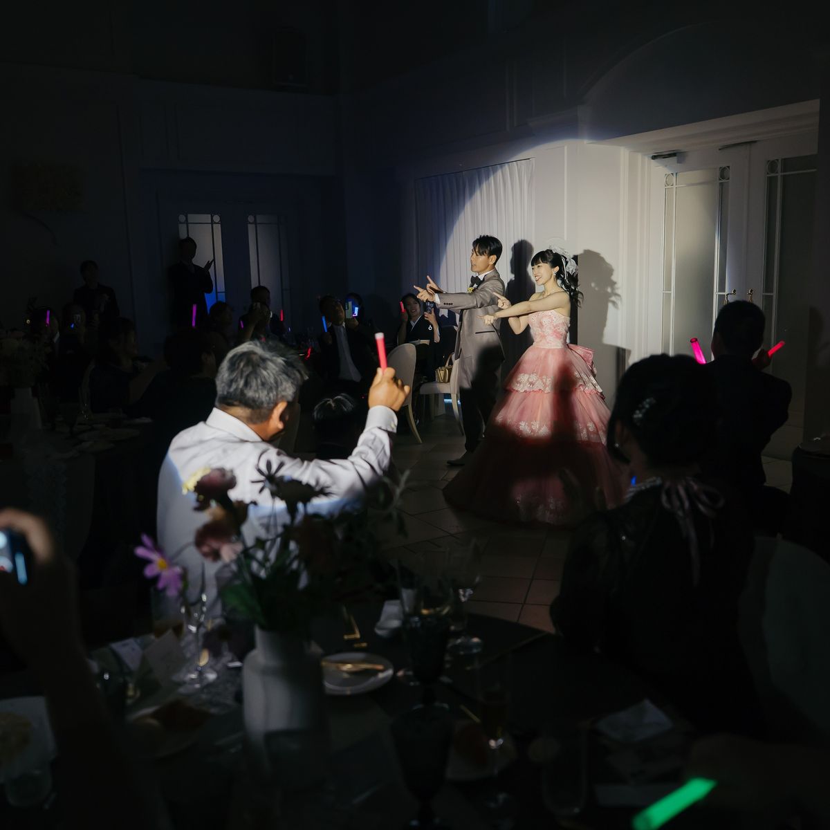 再入場ではおふたりで『恋ダンス』を披露され、会場が一気に盛り上がりました。普段ダンスをしないご新郎も本番では完璧に踊り切り、ゲストからは大きな拍手が。ご新婦はPerfumeの「Spring of Life」を披露し、「結婚式で踊りたい」という夢を実現。ドレスのカラー当てクイズに使ったペンライトやゲスト持参のペンライトが輝き、たくさんの笑顔と大きな歓声に包まれた、心に残るワンシーンとなりました。