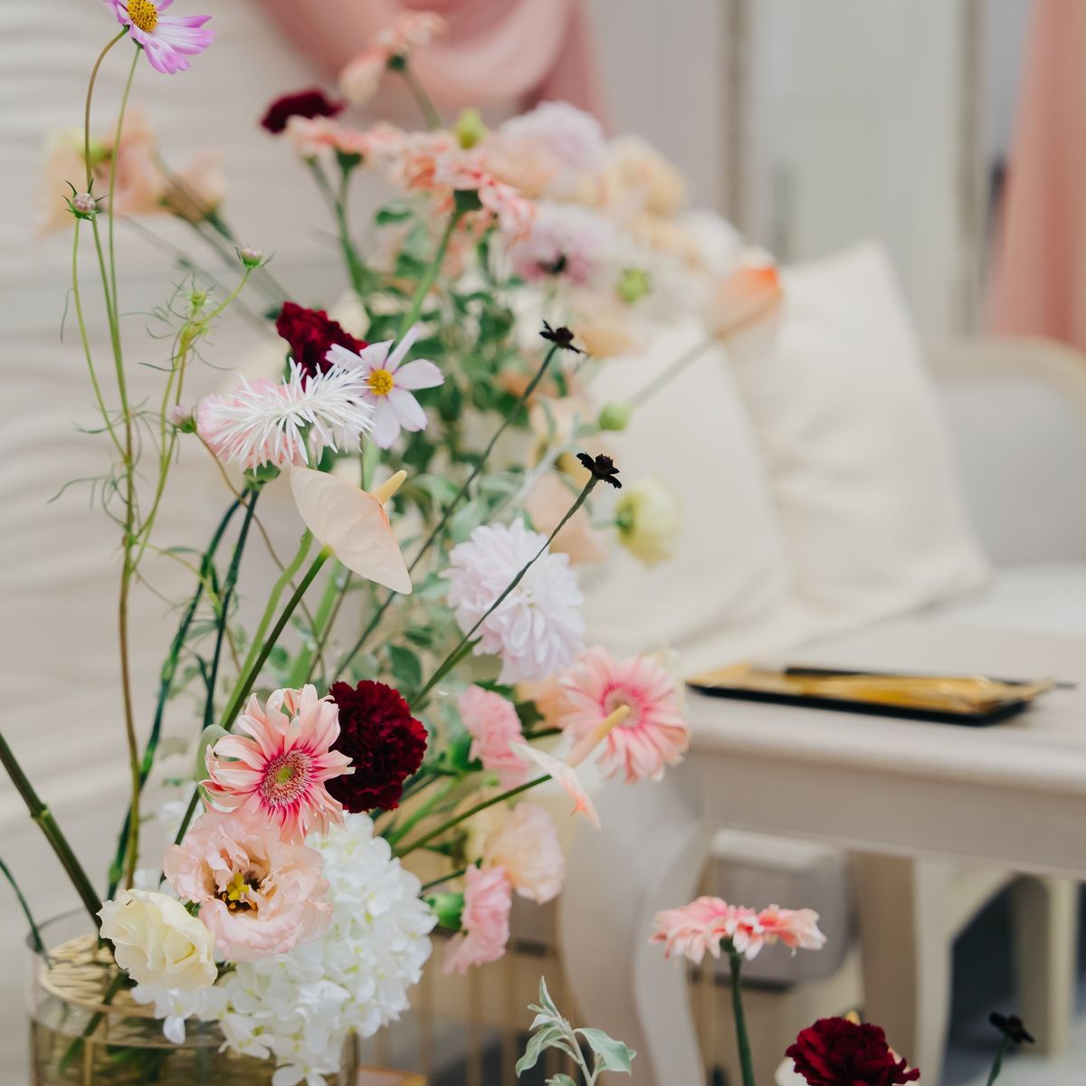 披露宴会場「ヴィラ アジュール」は白を基調とした上品な空間で、どんな色の装花やクロスも映えるのが特徴です。ご新婦好みのピンクをメインに使った可愛らしい世界観に仕上がり、「ダイエットを頑張った」という言葉通りに着こなした甘めピンクのドレスも映えていらっしゃいました。『KING OF PRISM』の登場キャラクターをイメージした8色のバラの飾りを添えたウェディングケーキもポイントです。