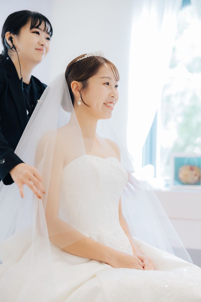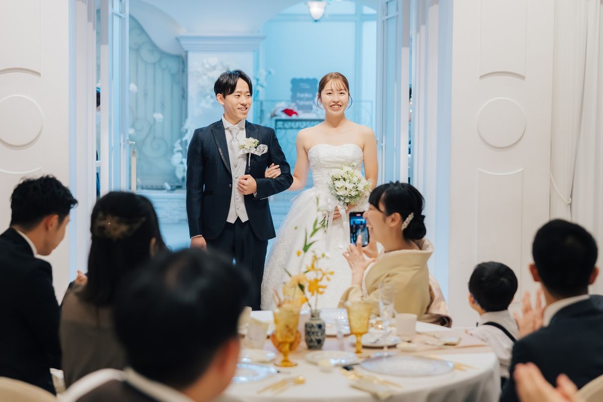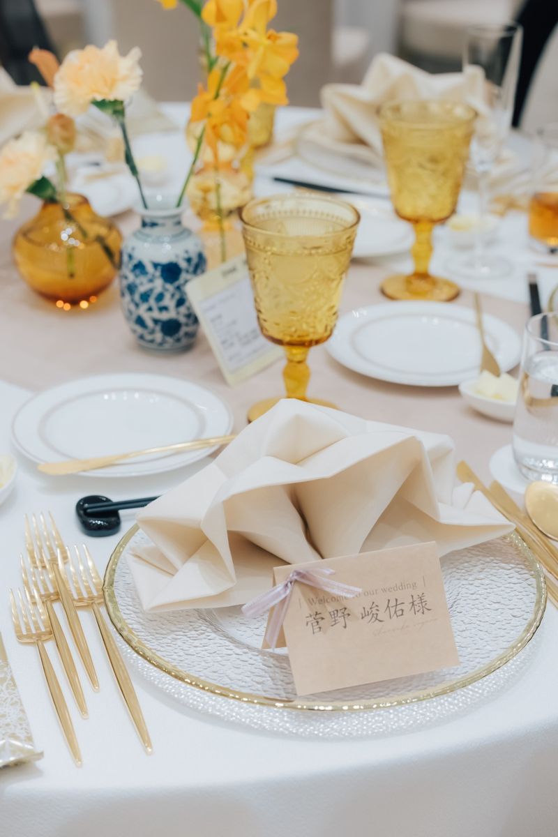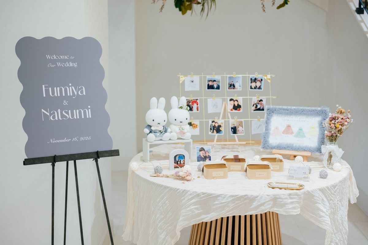 お仕事が忙しいおふたりは、少ない打ち合わせ回数の中で、効率よく準備を進められていたのが印象的です。不明な点や確認事項は、担当プランナーと随時メールで連絡を取り合うことで、安心して当日を迎えていただきました。 アクセサリーはレンタルではなく、自作したものや雑貨屋さんで購入したものを使用した他、招待状・席次表・メニュー表はwebにして、席札は自作するなど、細かい工夫をされています。