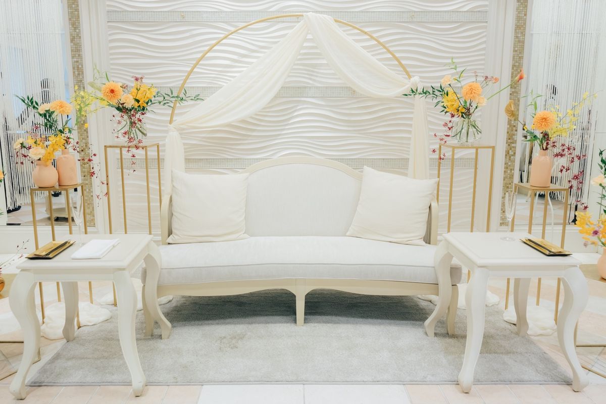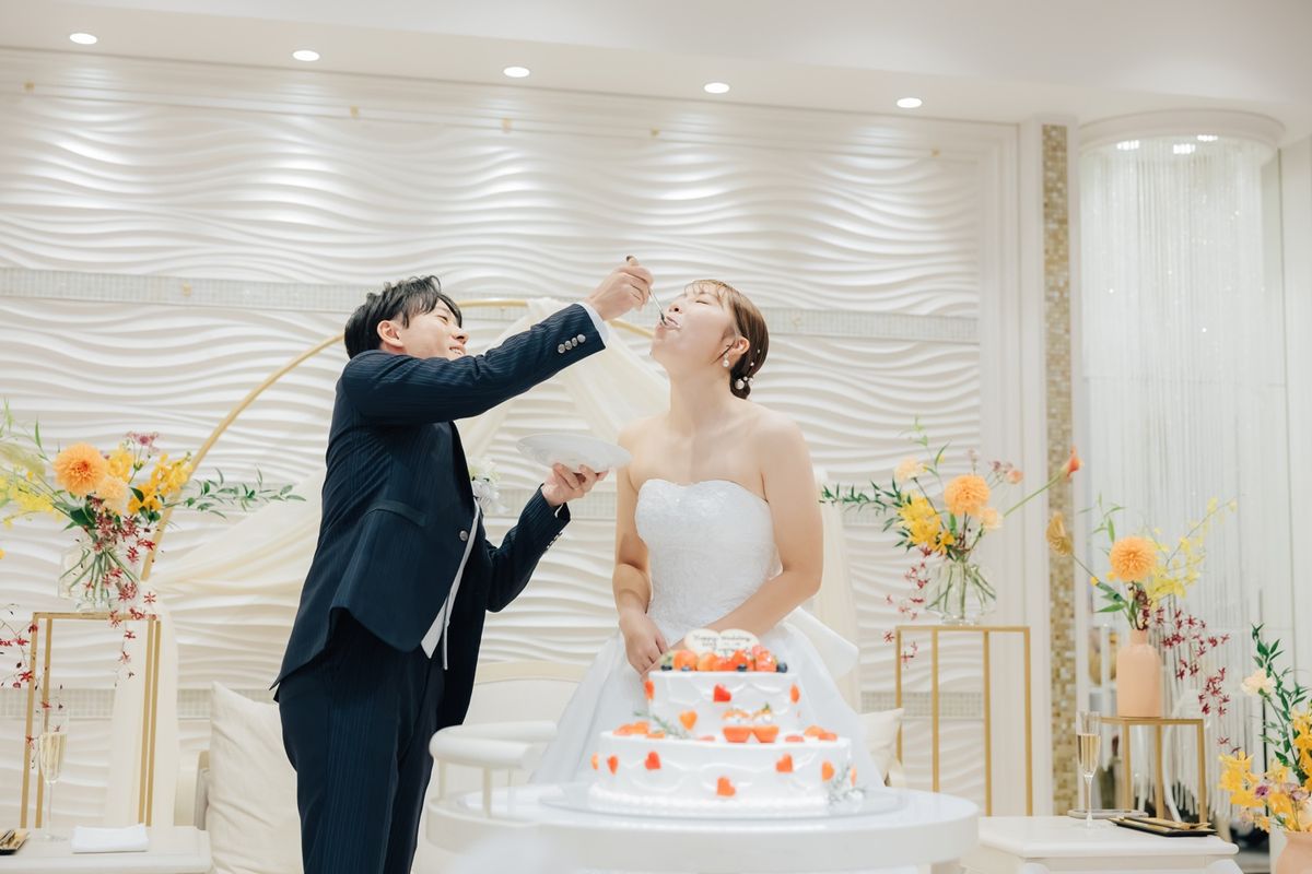 会場『アジュール』は白を基調としているため、どんな色でも合わせやすく、高砂から会場全体を見渡せる程よい広さが特徴です。全天候型のガーデンスペースがあり、おふたりはスイーツビュッフェやウェルカムパーティなどを取り入れて楽しまれました。 お料理は、おふたりが「ぜひみんなに食べて欲しい」というほど気に入った魚料理が入ったコースを選択。お料理もスイーツビュッフェもゲストの皆様から大変好評でした。