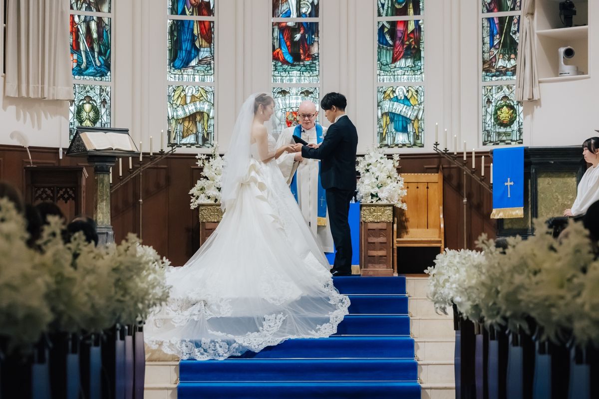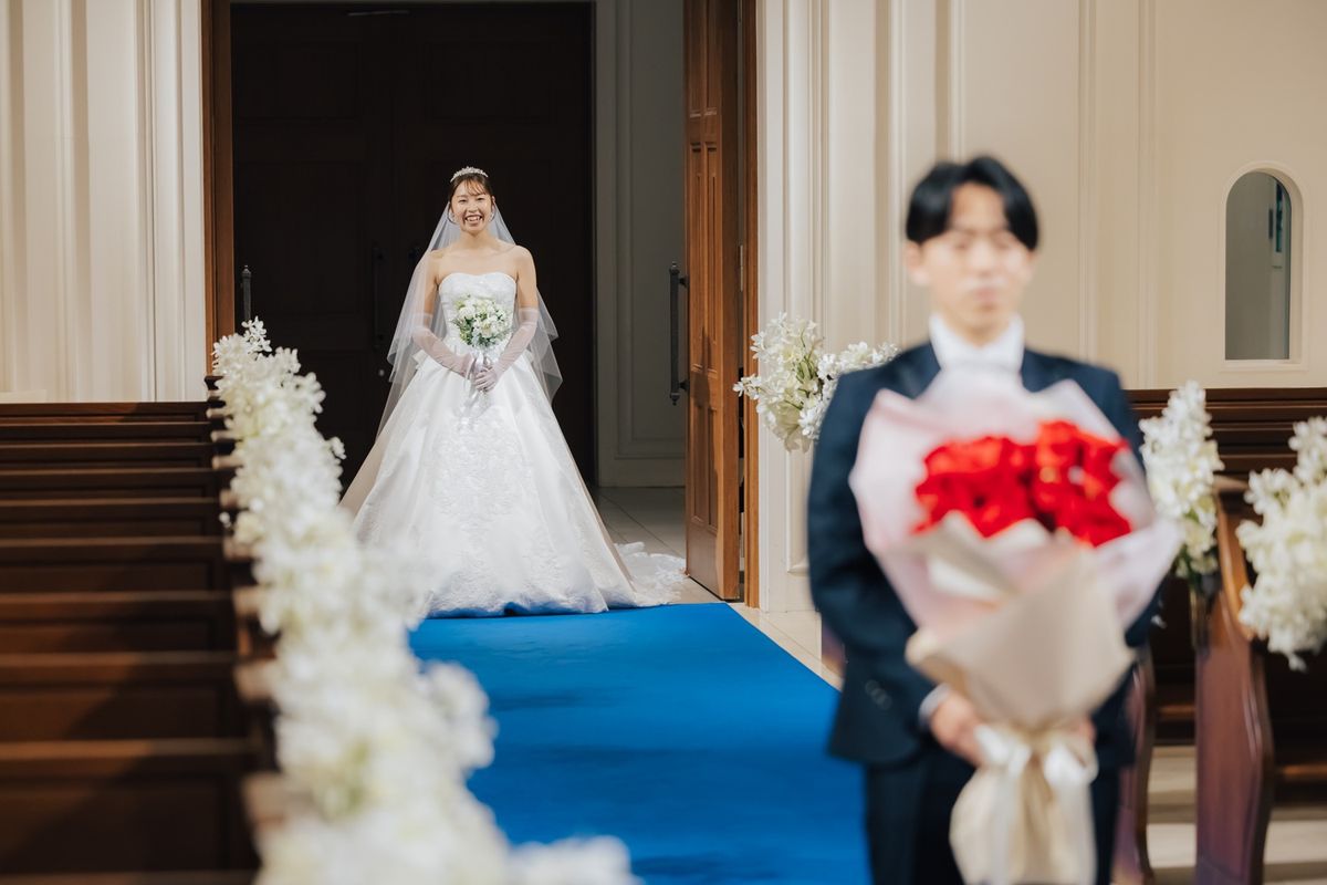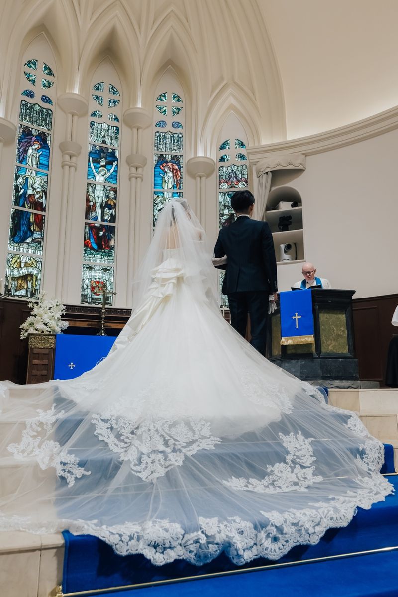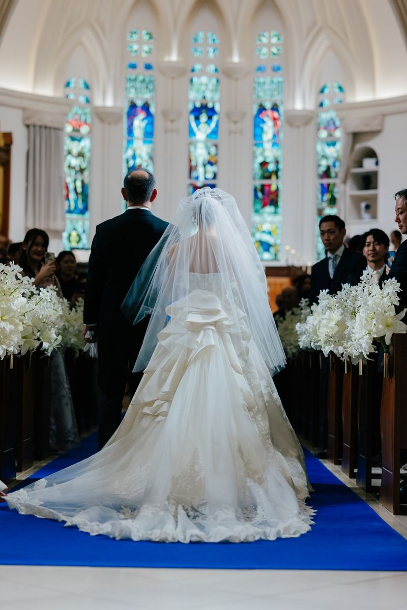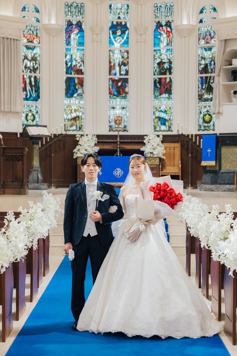 おふたりが当式場を選ぶ決め手になったのは、チャペルのステンドグラスと、青いバージンロードに惹かれたことだそう。120年の歴史を刻むステンドグラスの重厚感と、天井高11mの開放感ある空間をとても気に入ってくださいました。当日は、青いバージンロードにトレーンの長いウェディングドレスがひと際美しく映え、素敵なお写真をたくさん撮影されています。