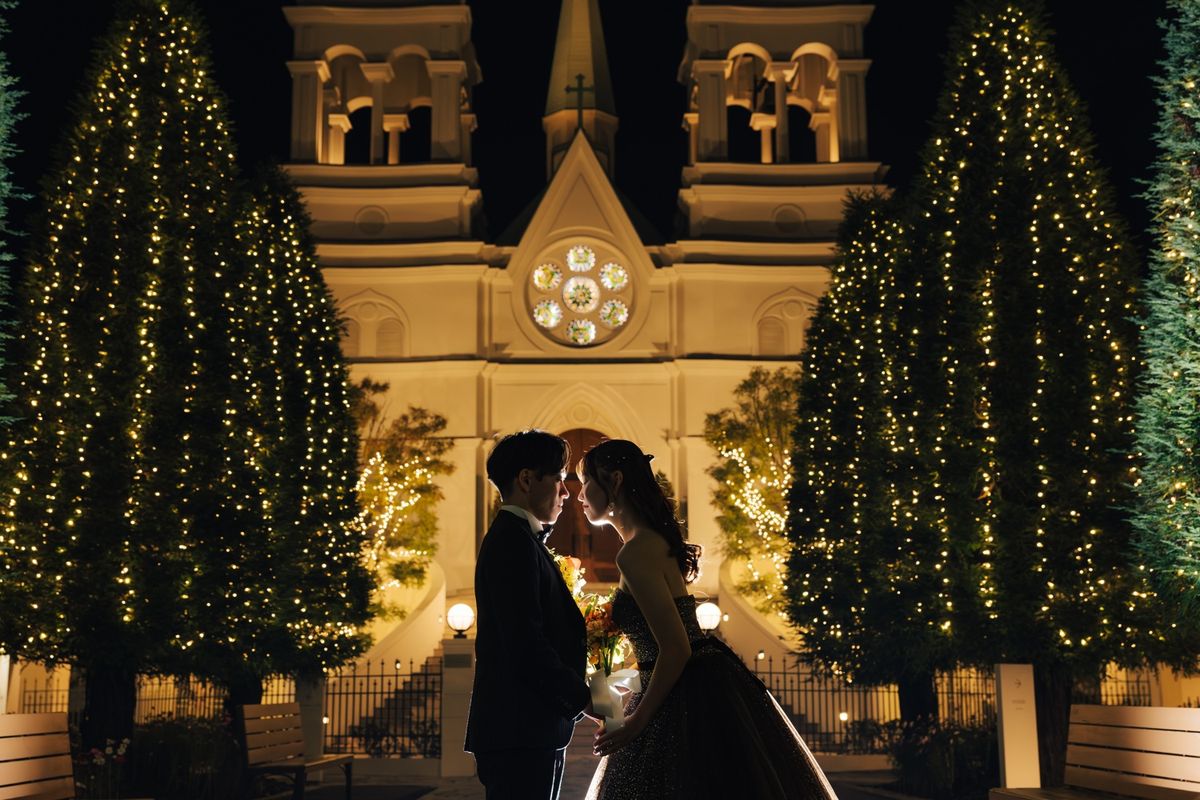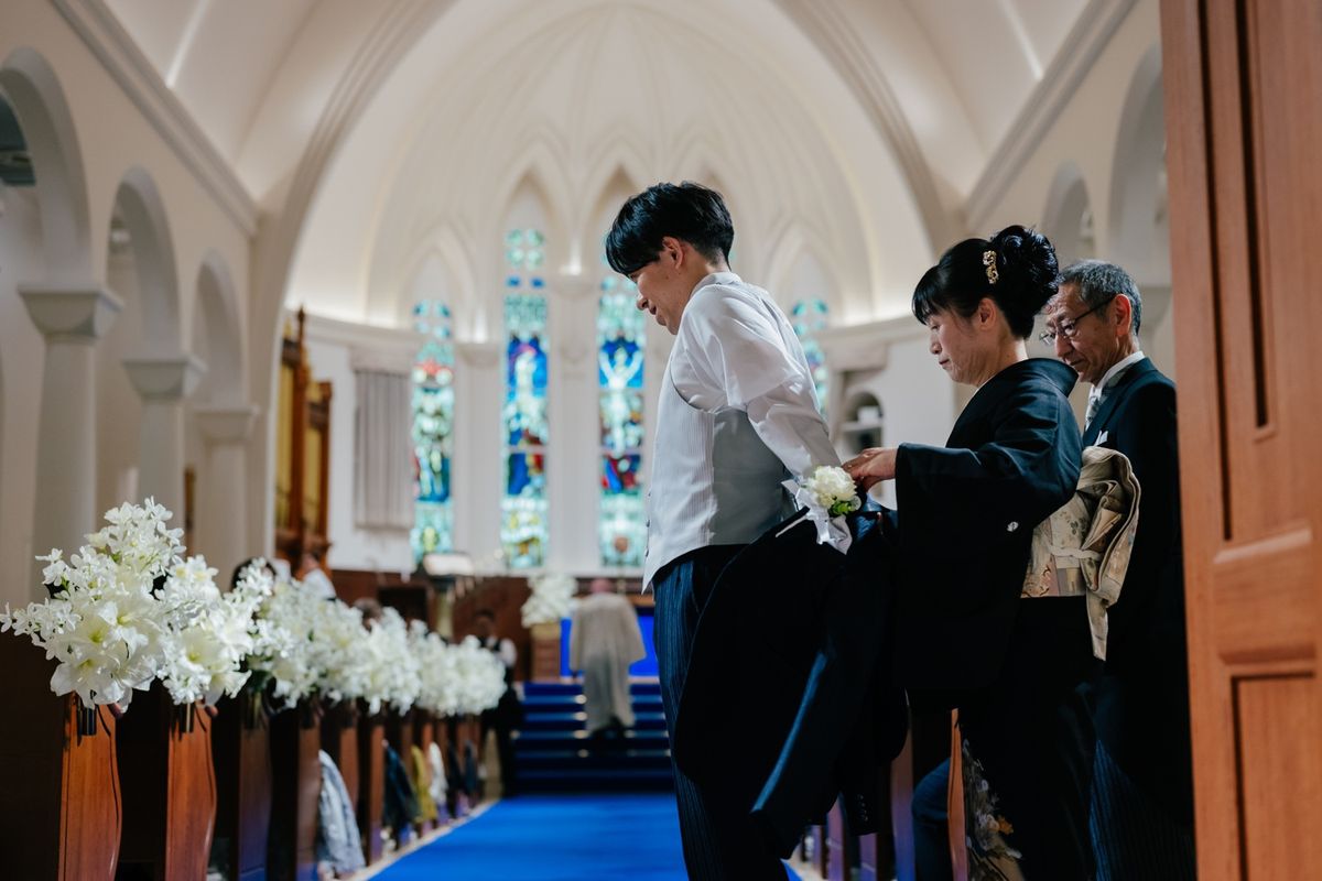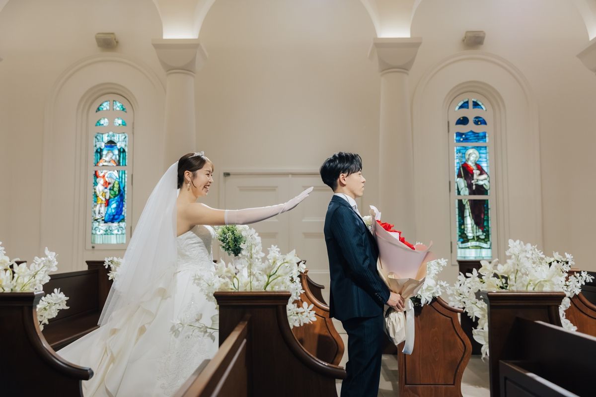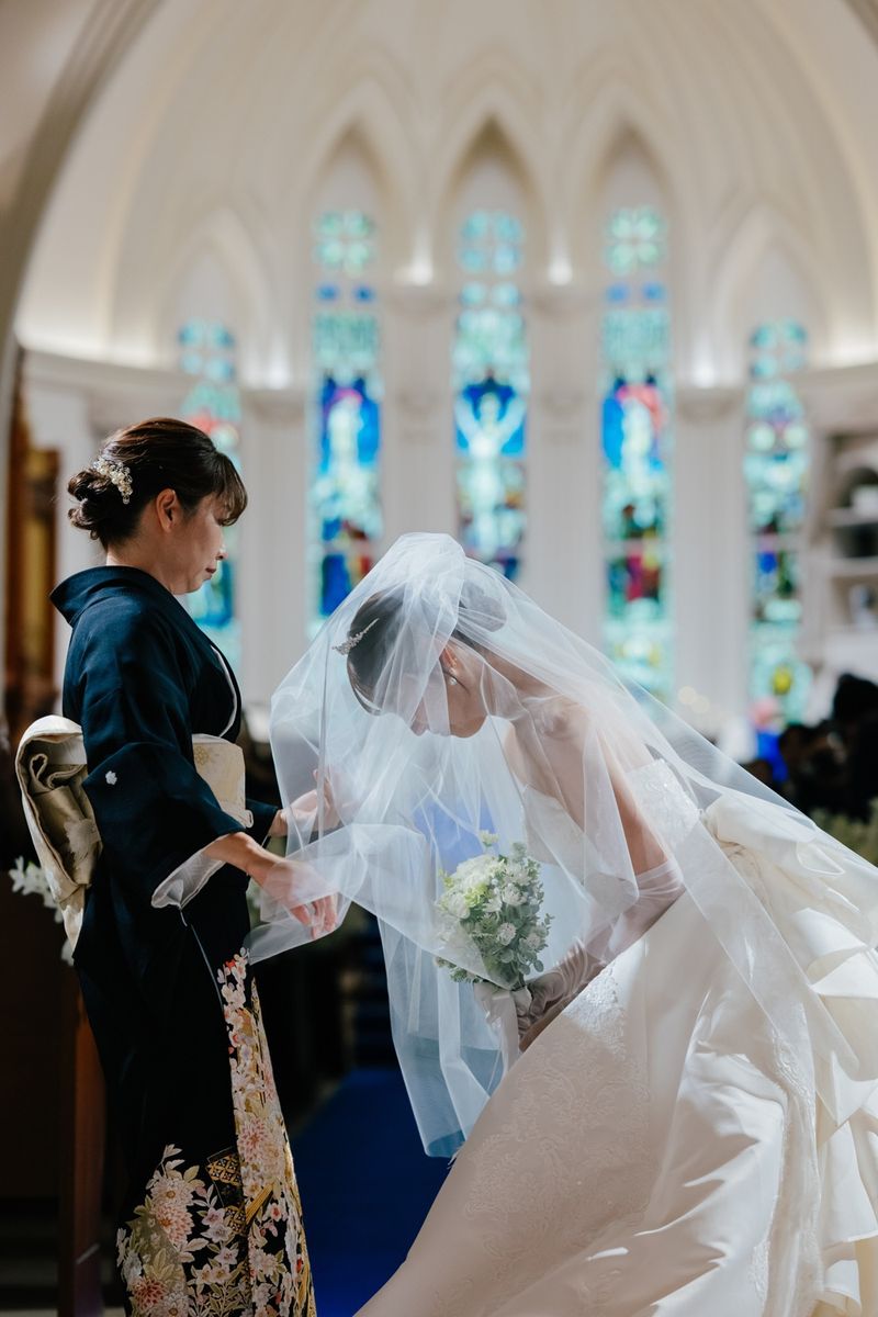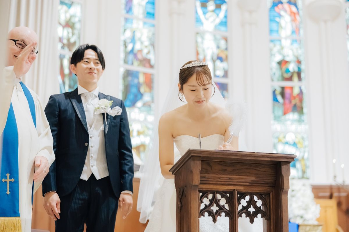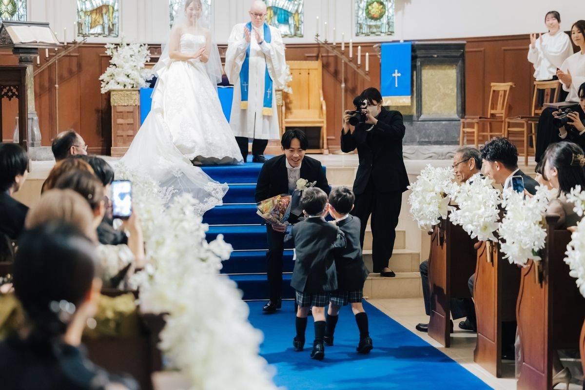 おふたりが当式場を選ぶ決め手になったのは、チャペルのステンドグラスと、青いバージンロードに惹かれたことだそう。120年の歴史を刻むステンドグラスの重厚感と、天井高11mの開放感ある空間をとても気に入ってくださいました。当日は、青いバージンロードにトレーンの長いウェディングドレスがひと際美しく映え、素敵なお写真をたくさん撮影されています。