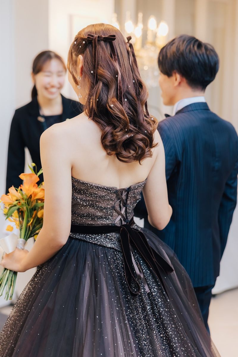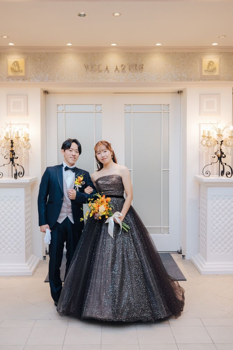 1着目は当社オリジナルのウェディングドレスです。重厚感のある刺繍と生地、トレーンが長くバージンロードに映えるところを気に入って決めたそう。 2着目はブラウンのキラキラしたドレスを着用。360度どこから見ても煌めき、ウエストのベロアリボンがアクセントになって素敵でした。 装花はイメージカラーのオレンジを使ったアレンジです。一輪挿しのようにお洒落にまとめることで、アットホーム感を演出されていました。