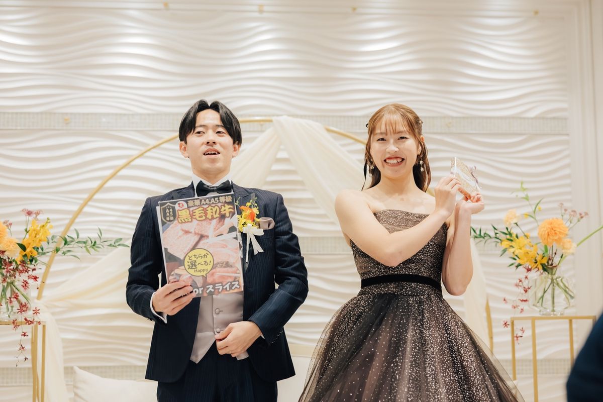 笑顔が印象的なおふたりは、衣装選びや雰囲気作りにこだわり、豪華さよりもアットホーム感を大切にした結婚式を実現されました。会場をイメージカラーのオレンジで彩り、ガーデン演出も取り入れています。