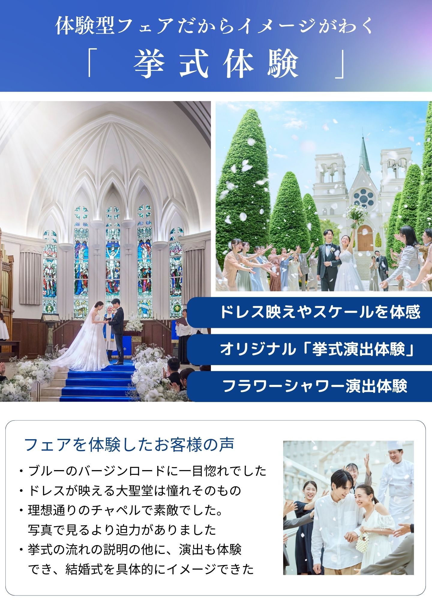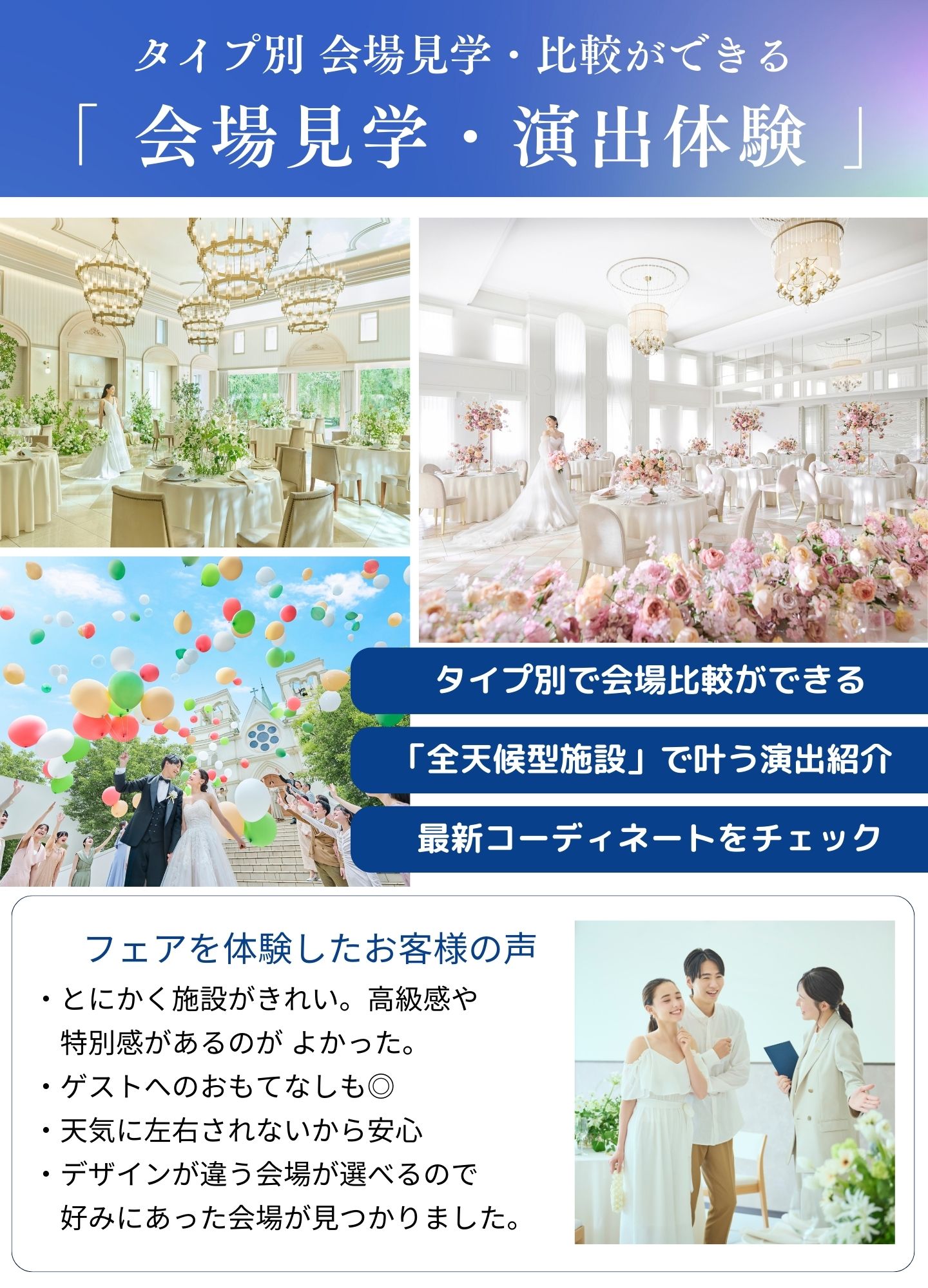 詳しい詳細や実際のチャペル・会場をご覧になることで、おふたりのご希望が明確になる方が多いので、迷われている場合はぜひフェアにご参加くださいませ。